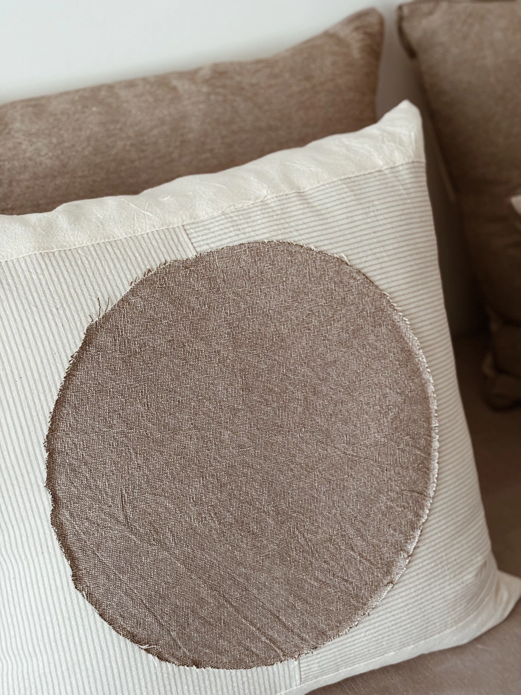 Almohadon con frente con recortes de tusor en distintos tonos y circulo color visón, y espalda en tusor crudo