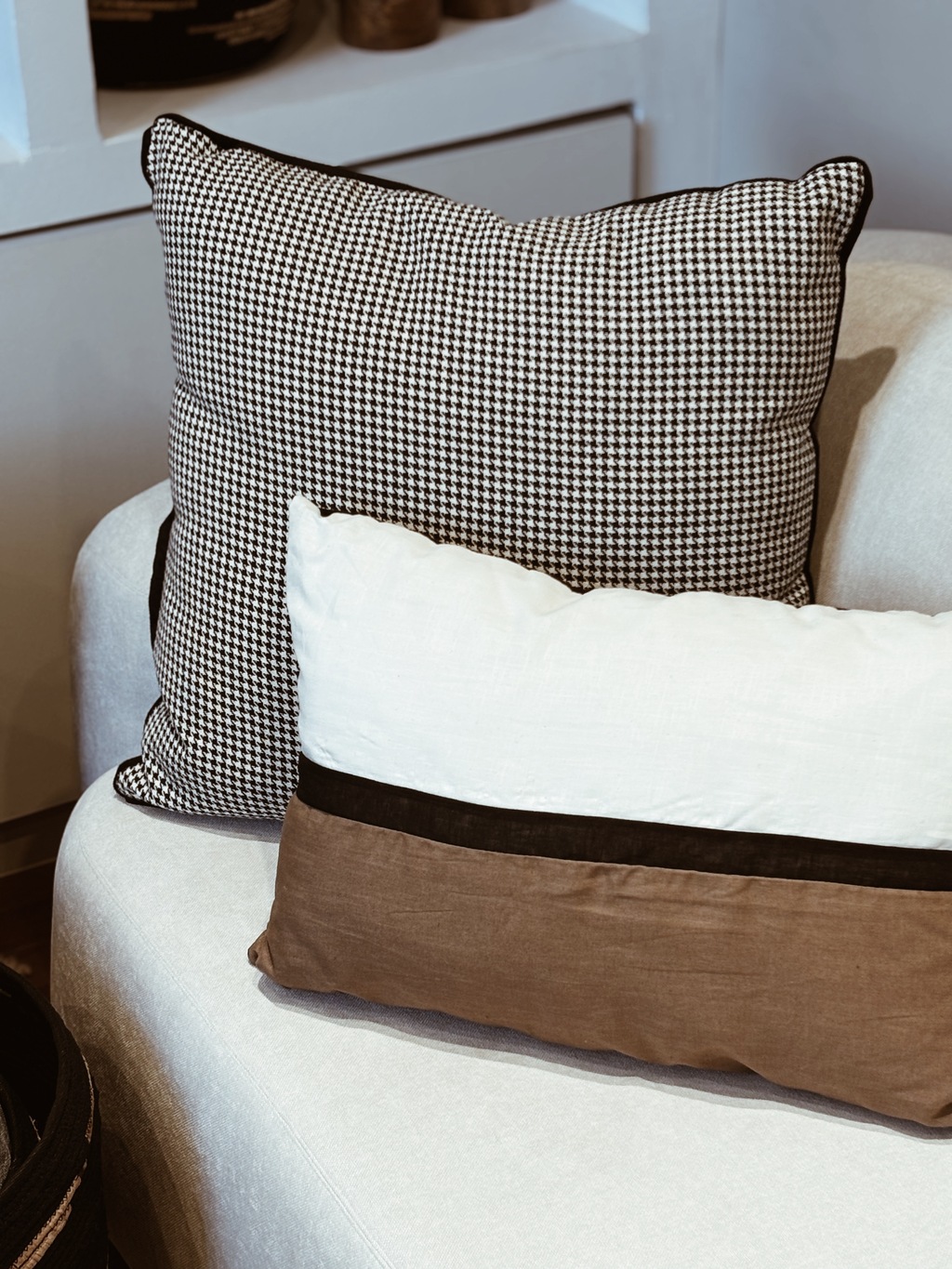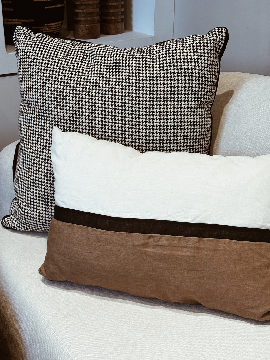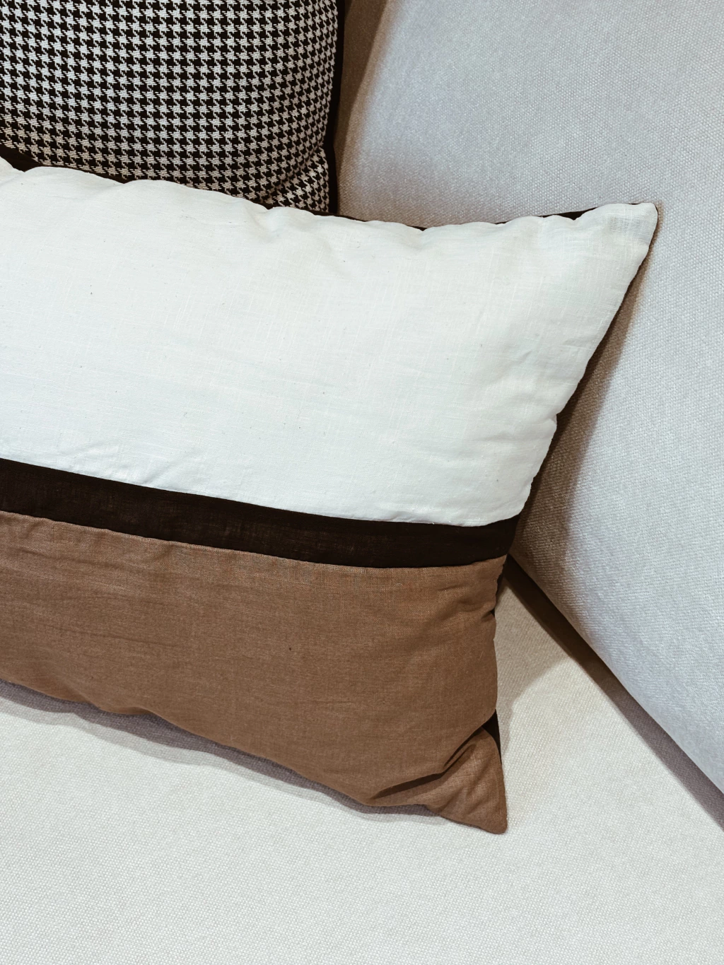 Almohadón con tapa de recortes de lino liviano en color blanco, negro y tabacoy espalda de lienzo color negro