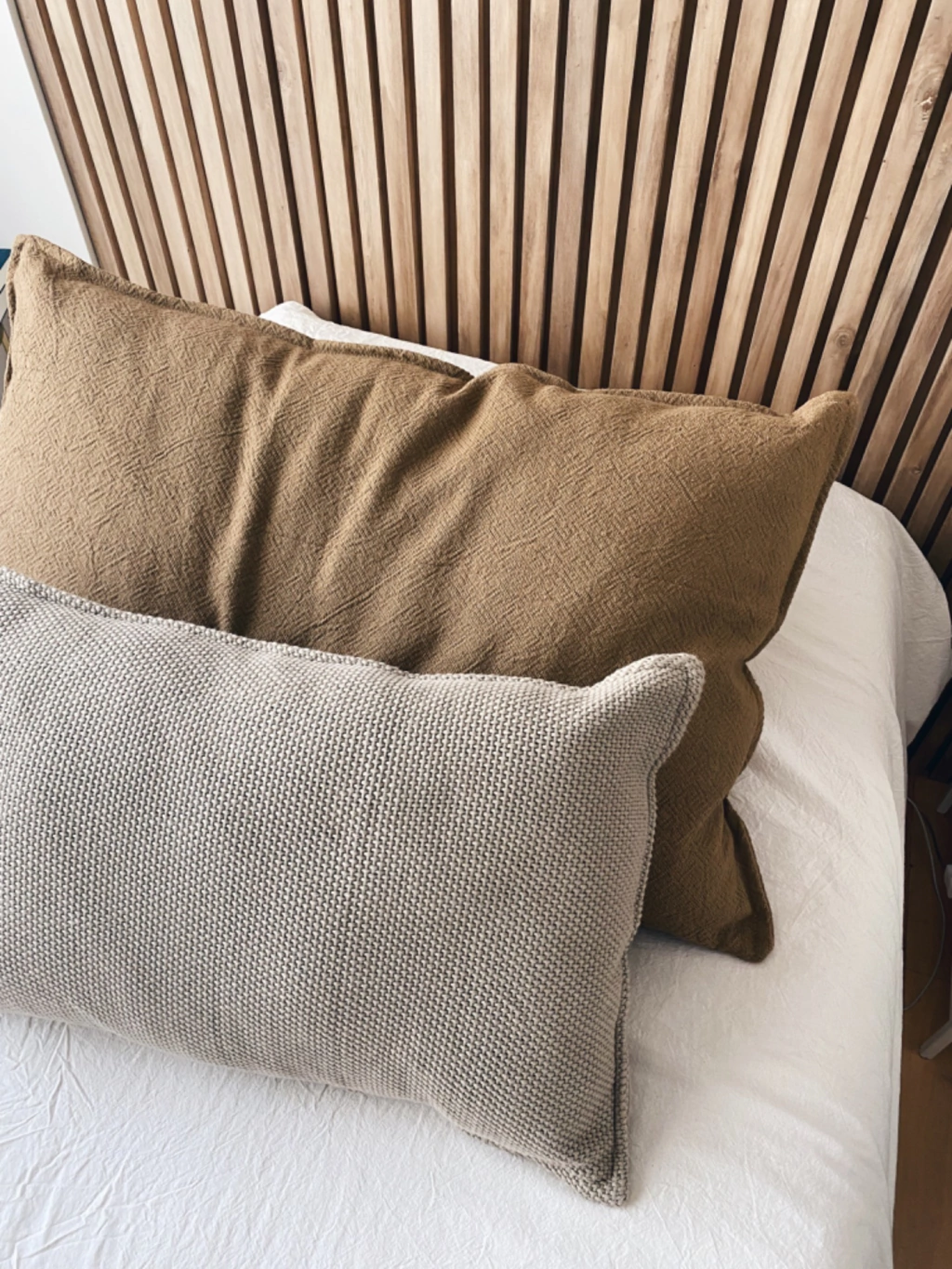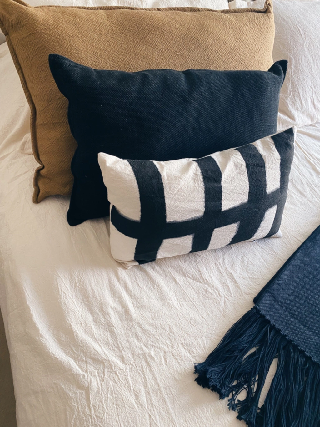Almohadón de tapa hecha en telar con hilo de algodón y espalda de lienzo. Combinalo con el pie de cama !