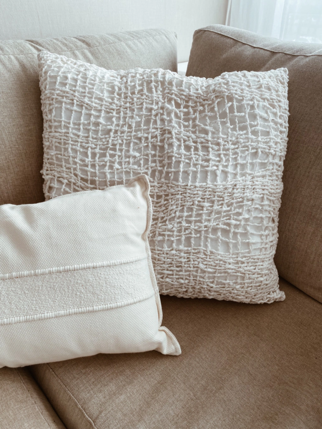 Almohadón confeccionado con tapa tejida en telar con hilo de algodón en color crudo, detalles en Bouclé. Espalda de lienzo a tono.
