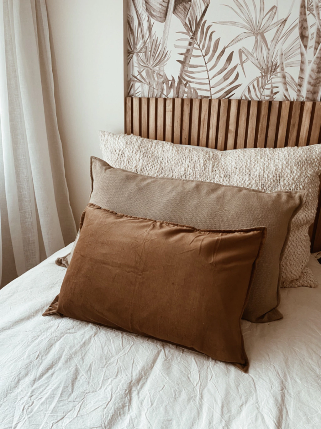 Almohadón con tapa de terciopelo en color habano, espalda de Lienzo, con faja de Terciopelo ocultando el cierre.