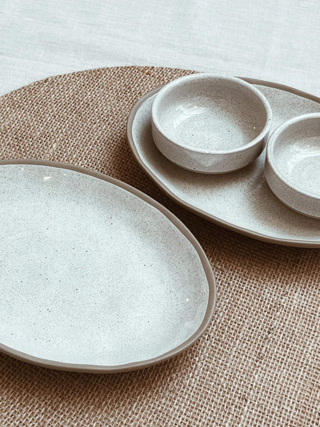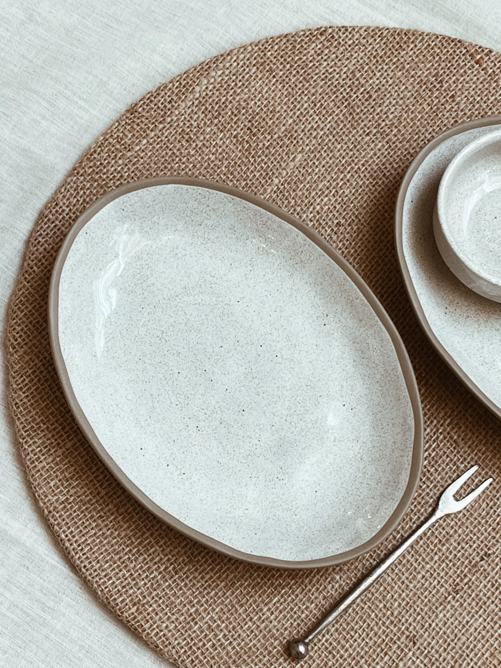 Bandeja oval de cerámica rústica esmaltada con borde en visón mate