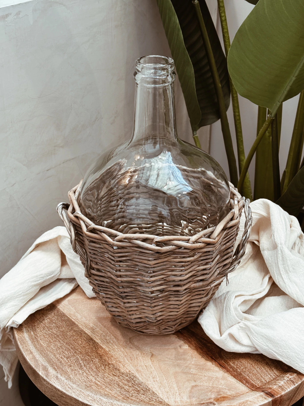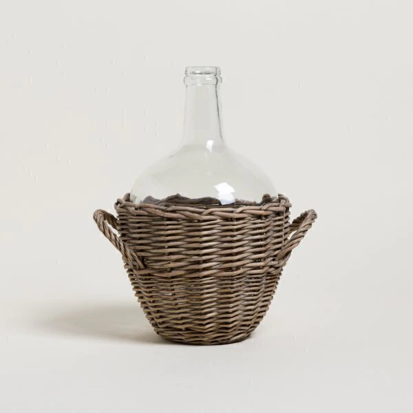Botellon de vidrio con base y manijas de sauce color gris gastado