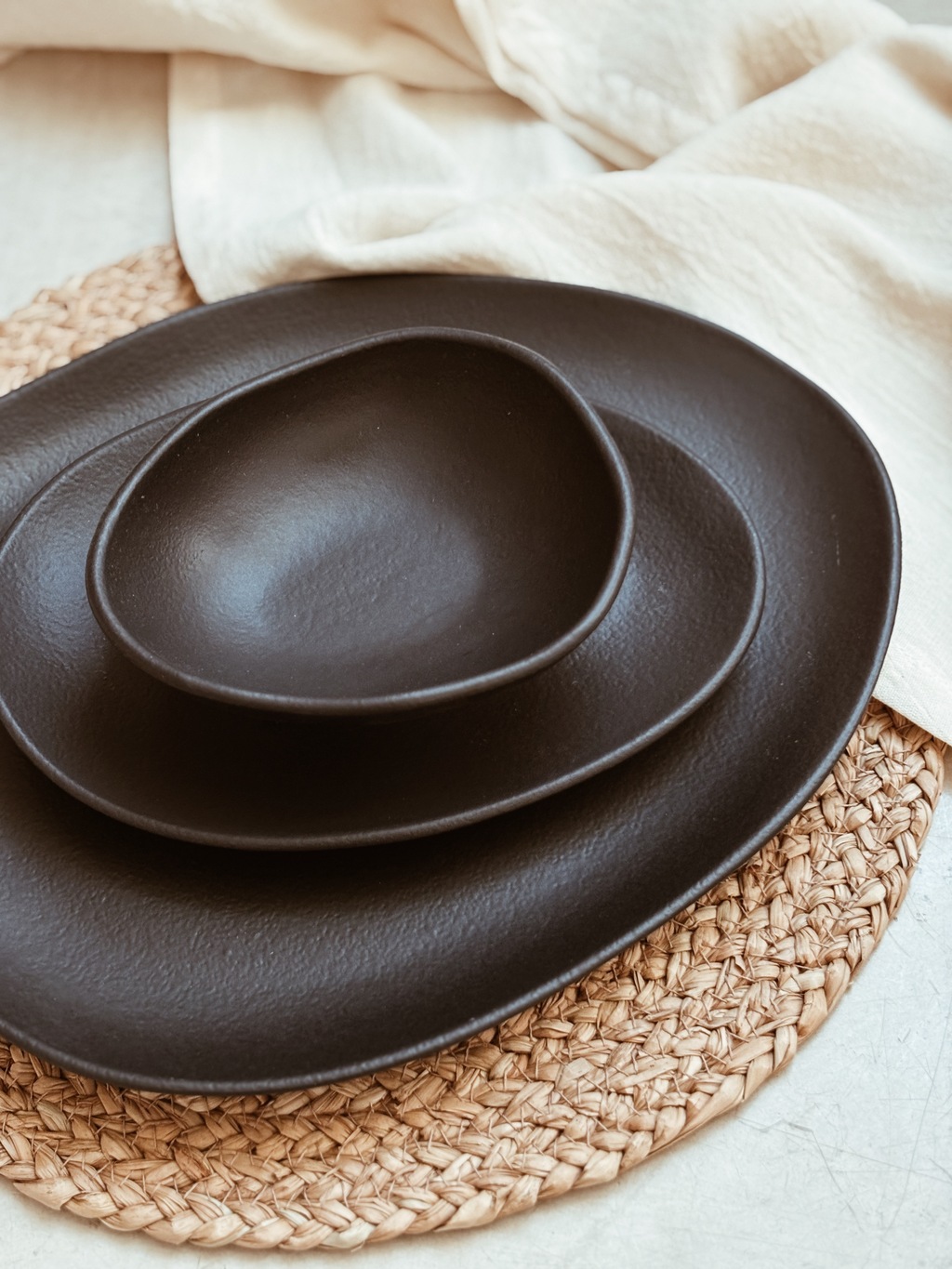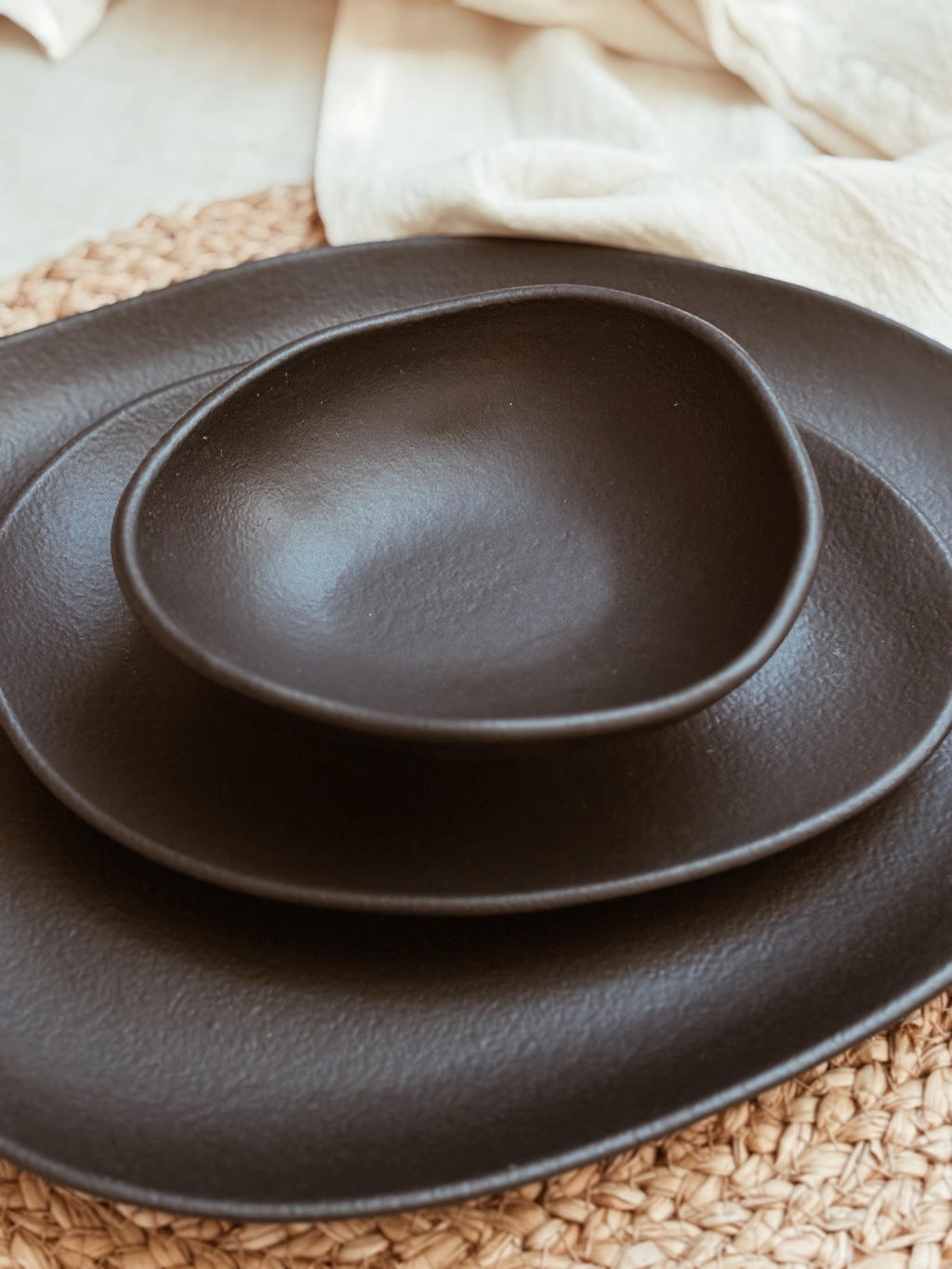 Bowl / compotera con forma irregular ovalada de cerámica de gres color negro mate con terminación rústica