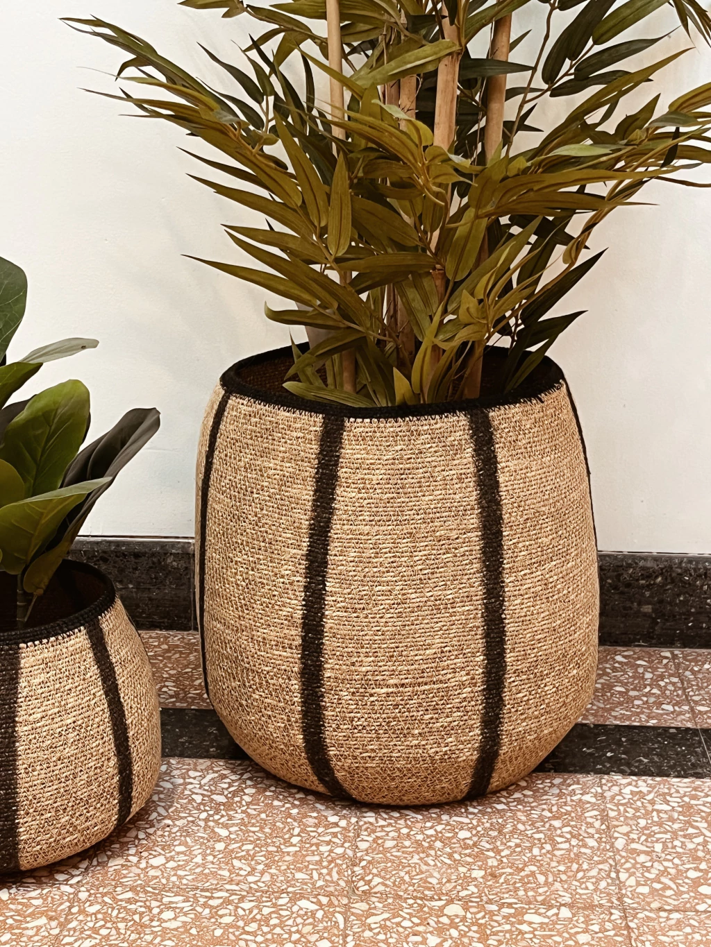 Canasto artesanal de seagras natural con rayas negras