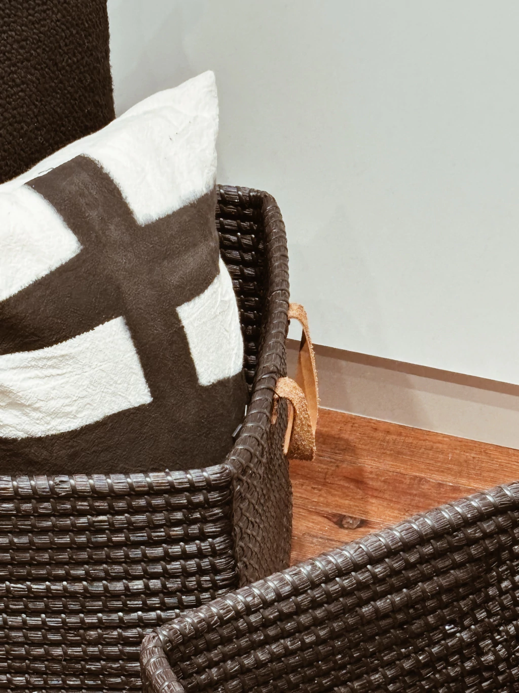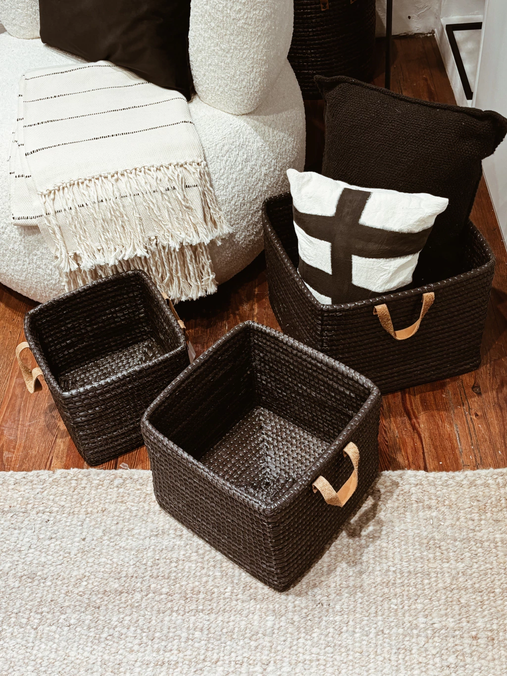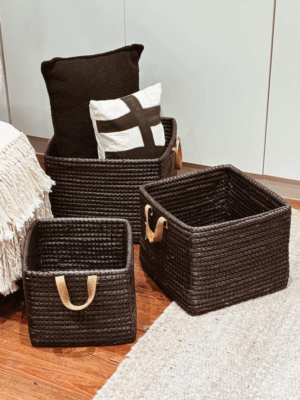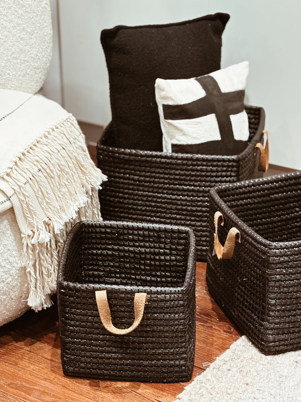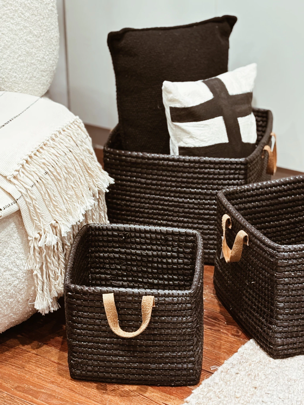 Canasto artesanal de fibras naturales color negro con manijas de cuero color suela