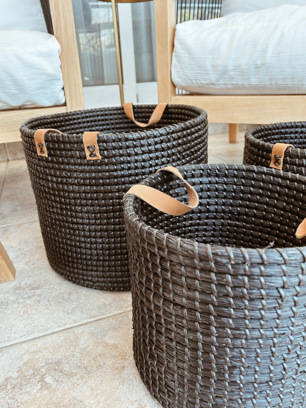 Canasto artesanal de fibras naturales color negro con manijas de cuero color suela