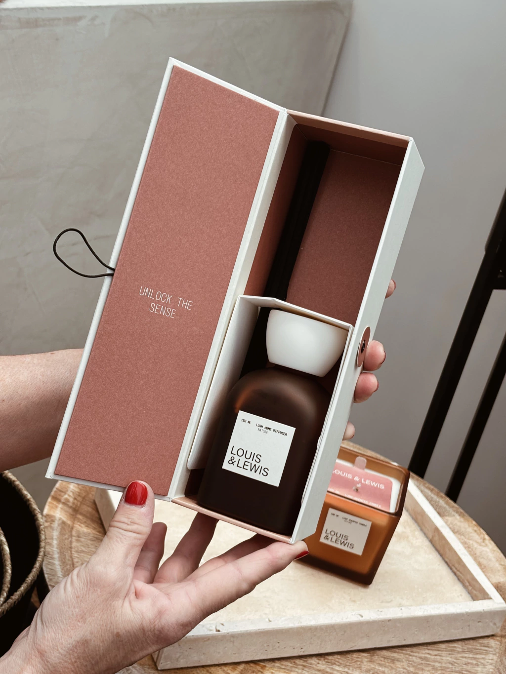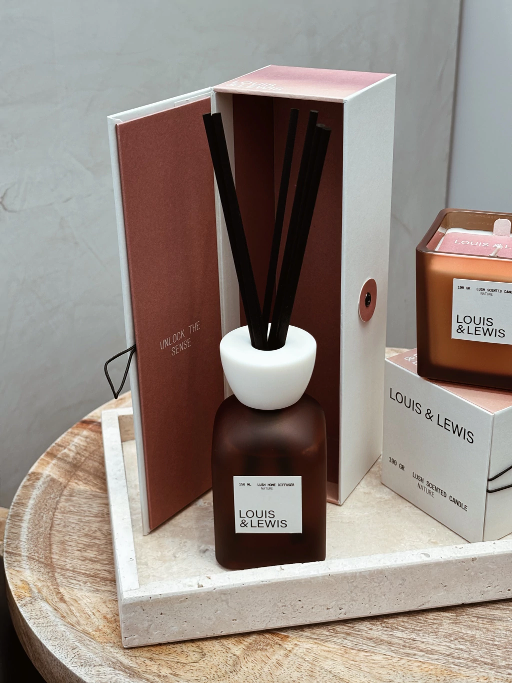 Difusor en envase de vidrio color marrón terminación esmerilada. Familia de la vela Lush.