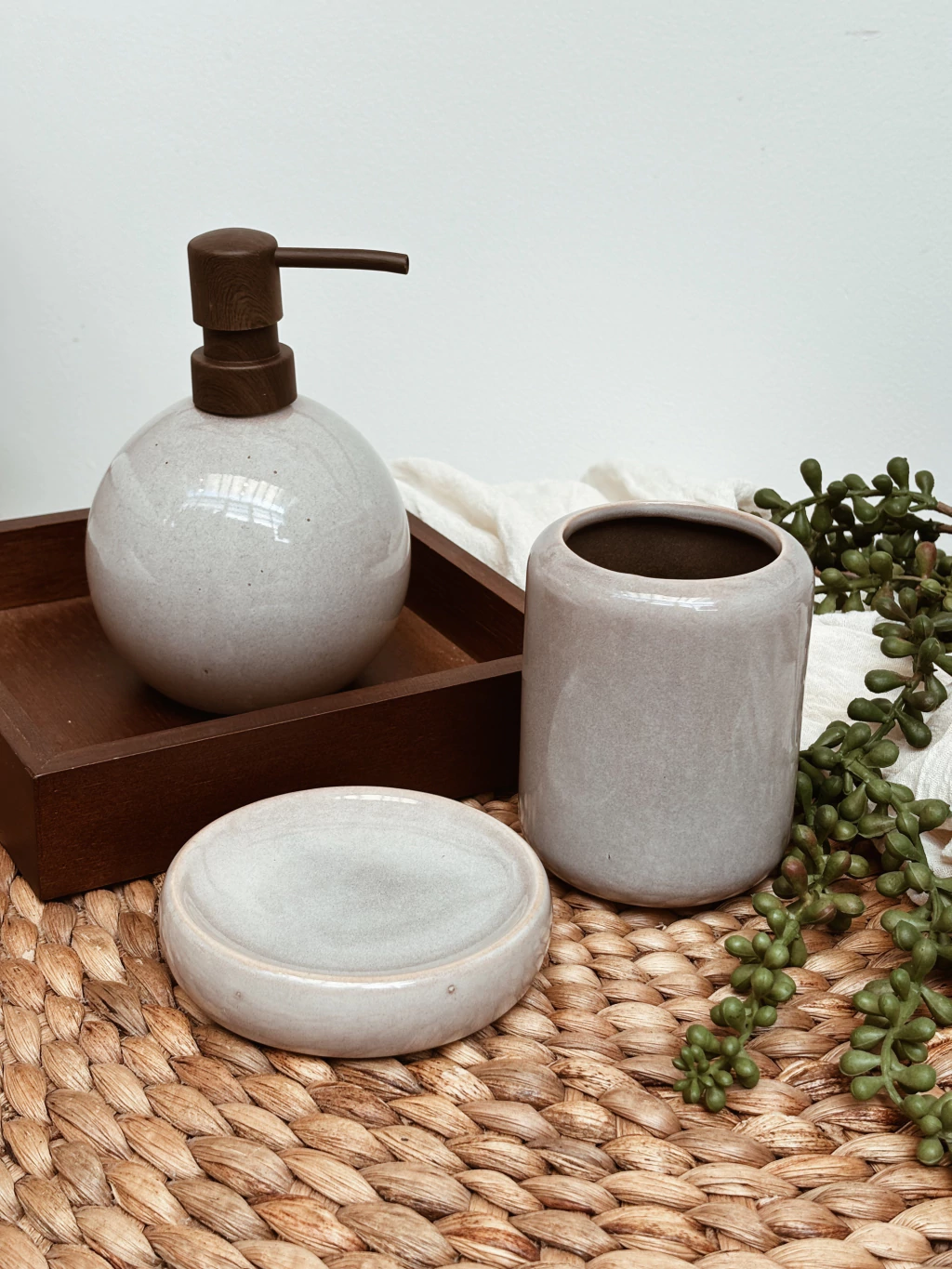 Dispenser de cerámica craquelada color gris claro con tapa en simil madera