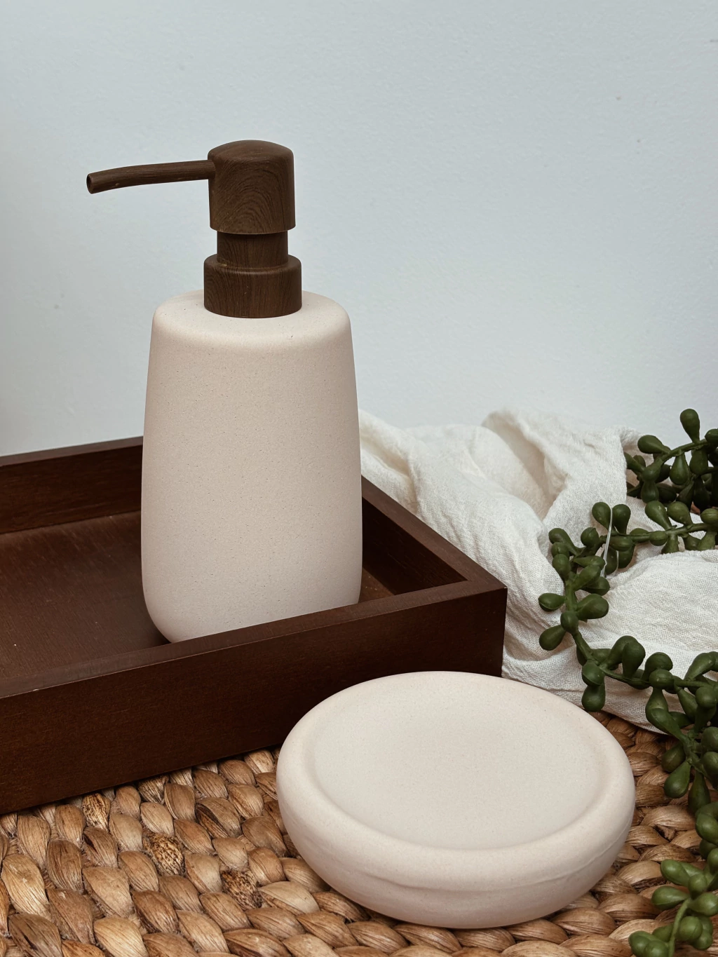 Dispenser de cerámica color beige/rosado claro terminación mate con tapa en simil madera