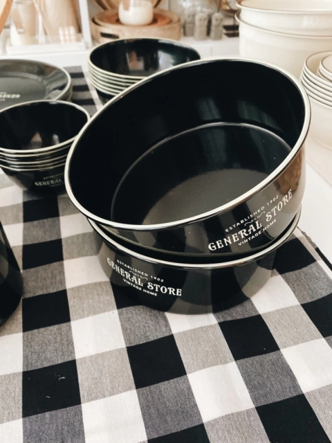 Ensaladera enlozada negra con bordes e inscripcion en crudo