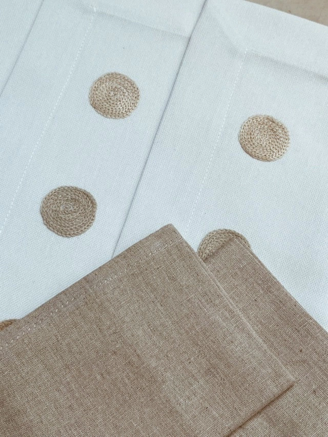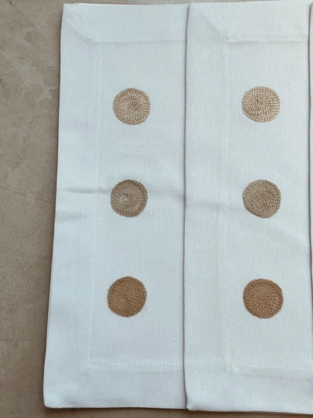 Set de 4 individuales y 4 servilletas en lino blanco con lunares bordados en colores naturales