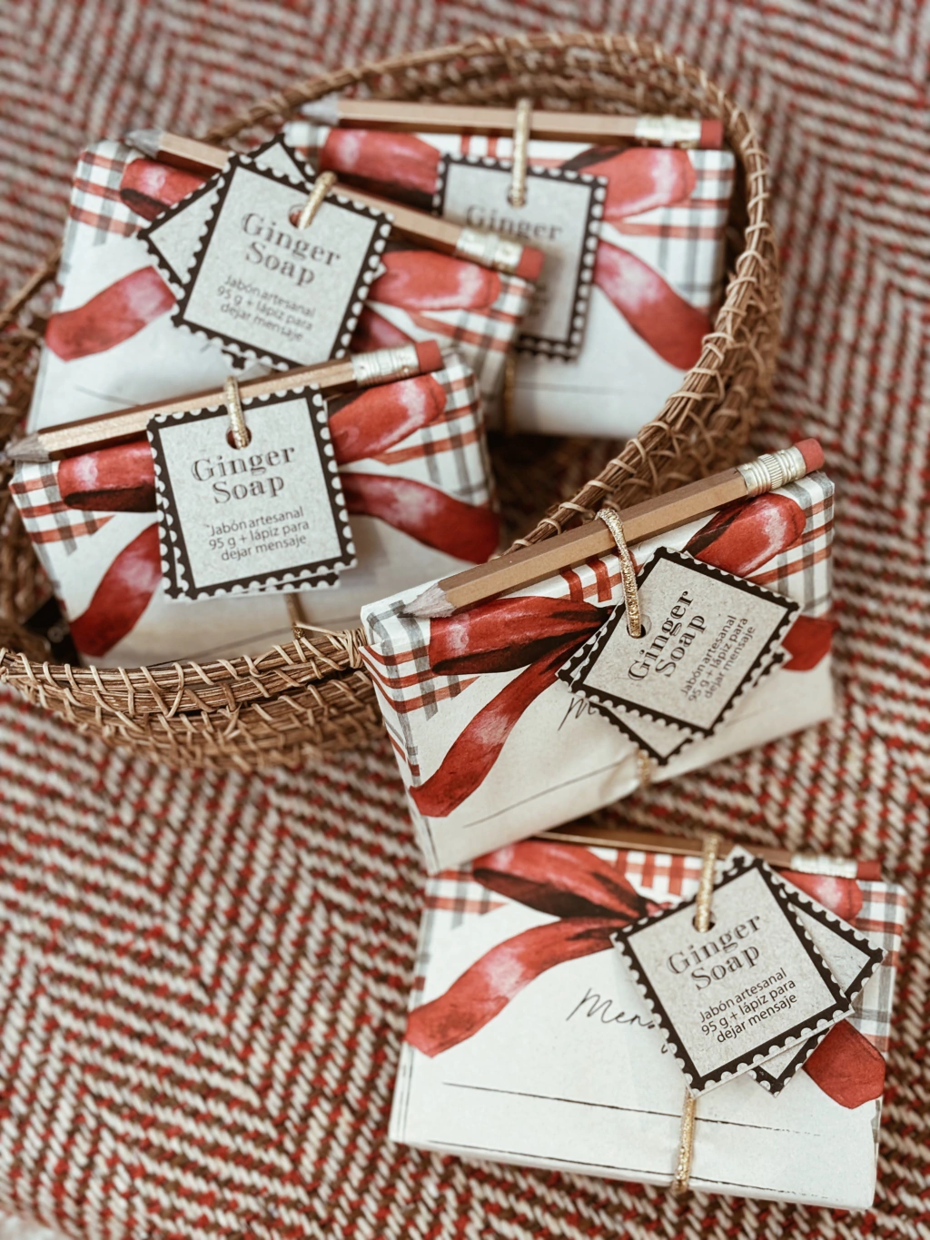 Jabón rectangular con mensaje en bajo relieve + Lápiz dorado con borrador. La presentación hacen al producto un must have para regalar y hacer una atención en estas fiestas. Su fragancia Ginger lo hacen aún mas especial.