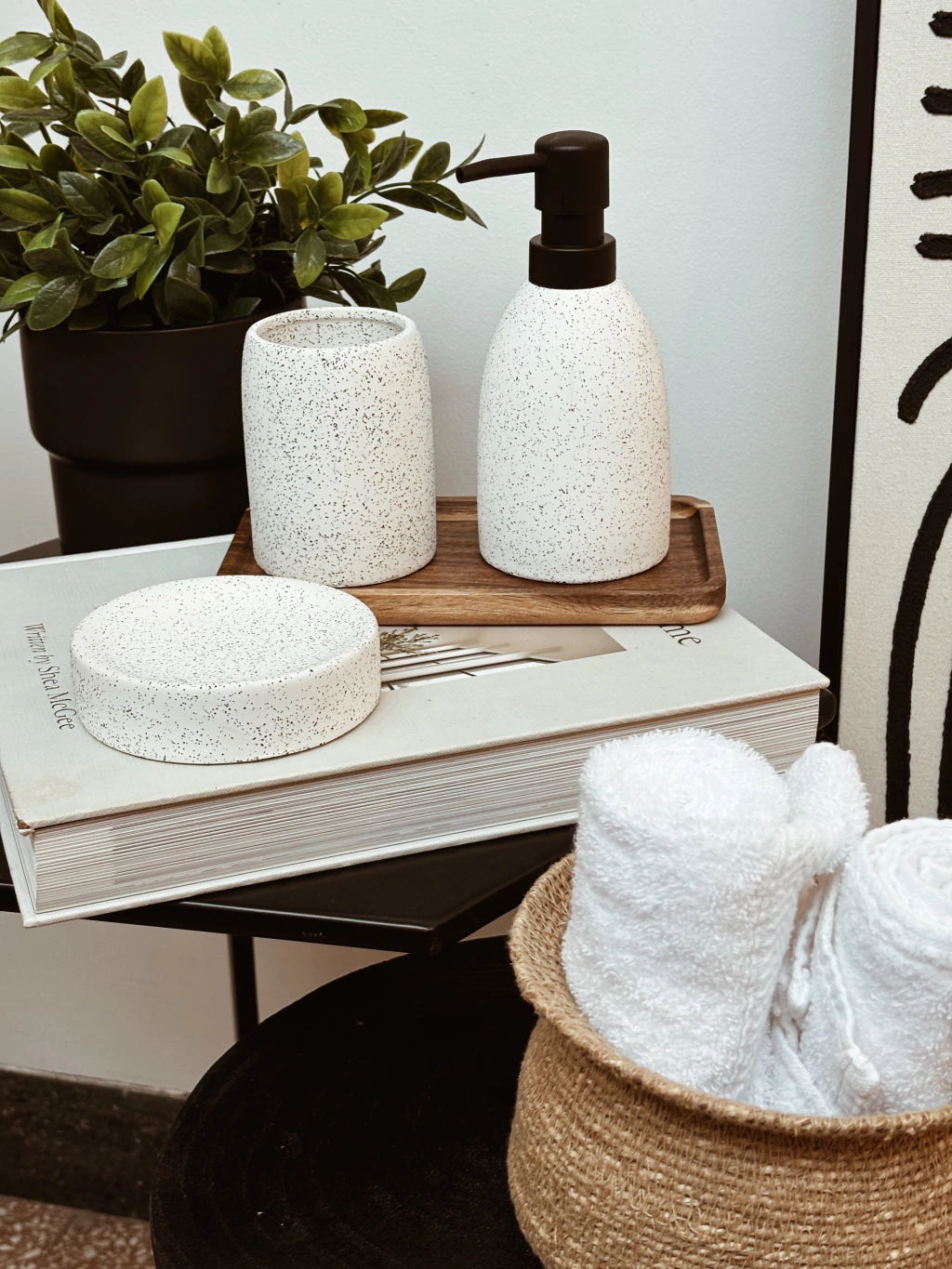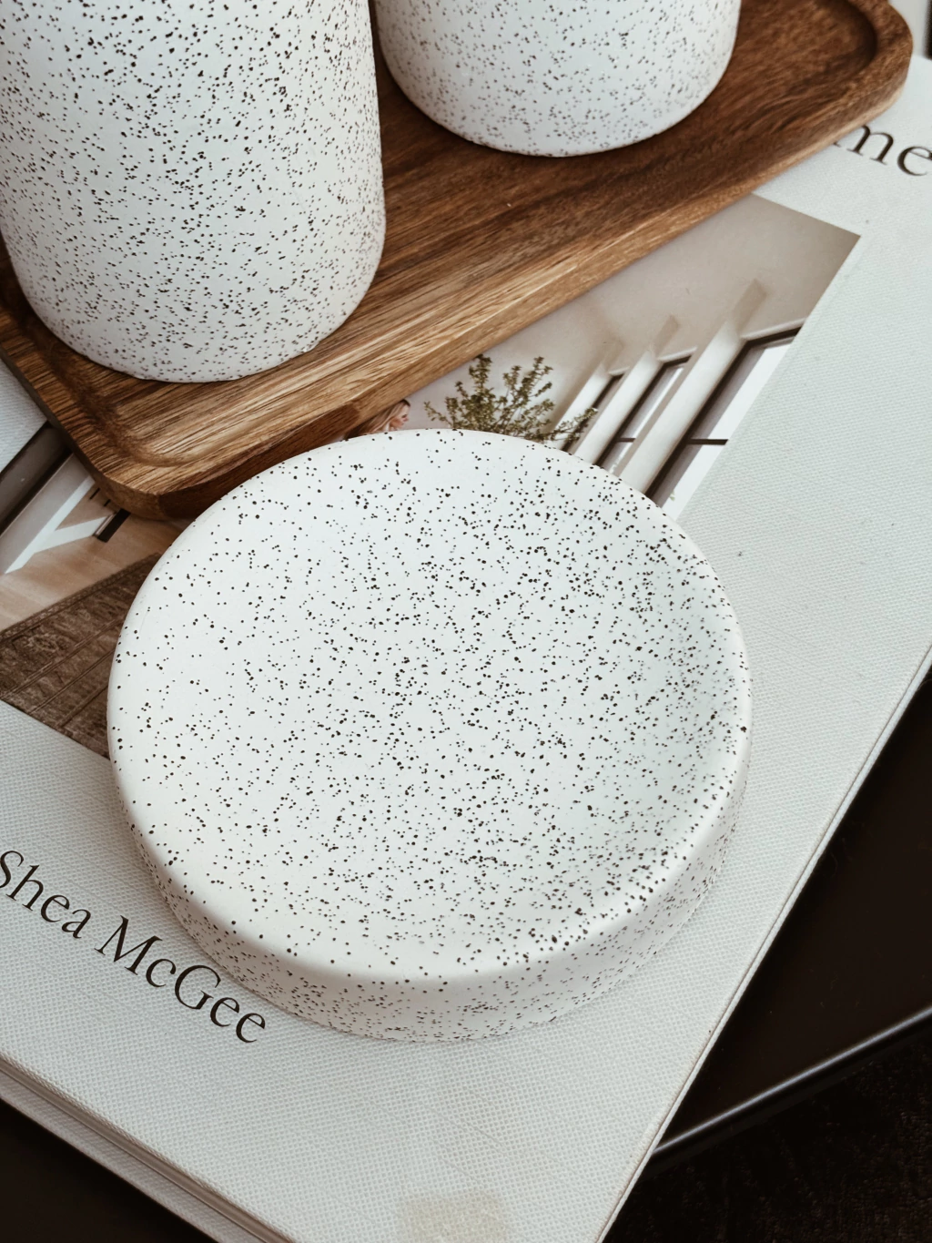 Jabonera redonda de ceramica blanco mate con salpicado en color negro