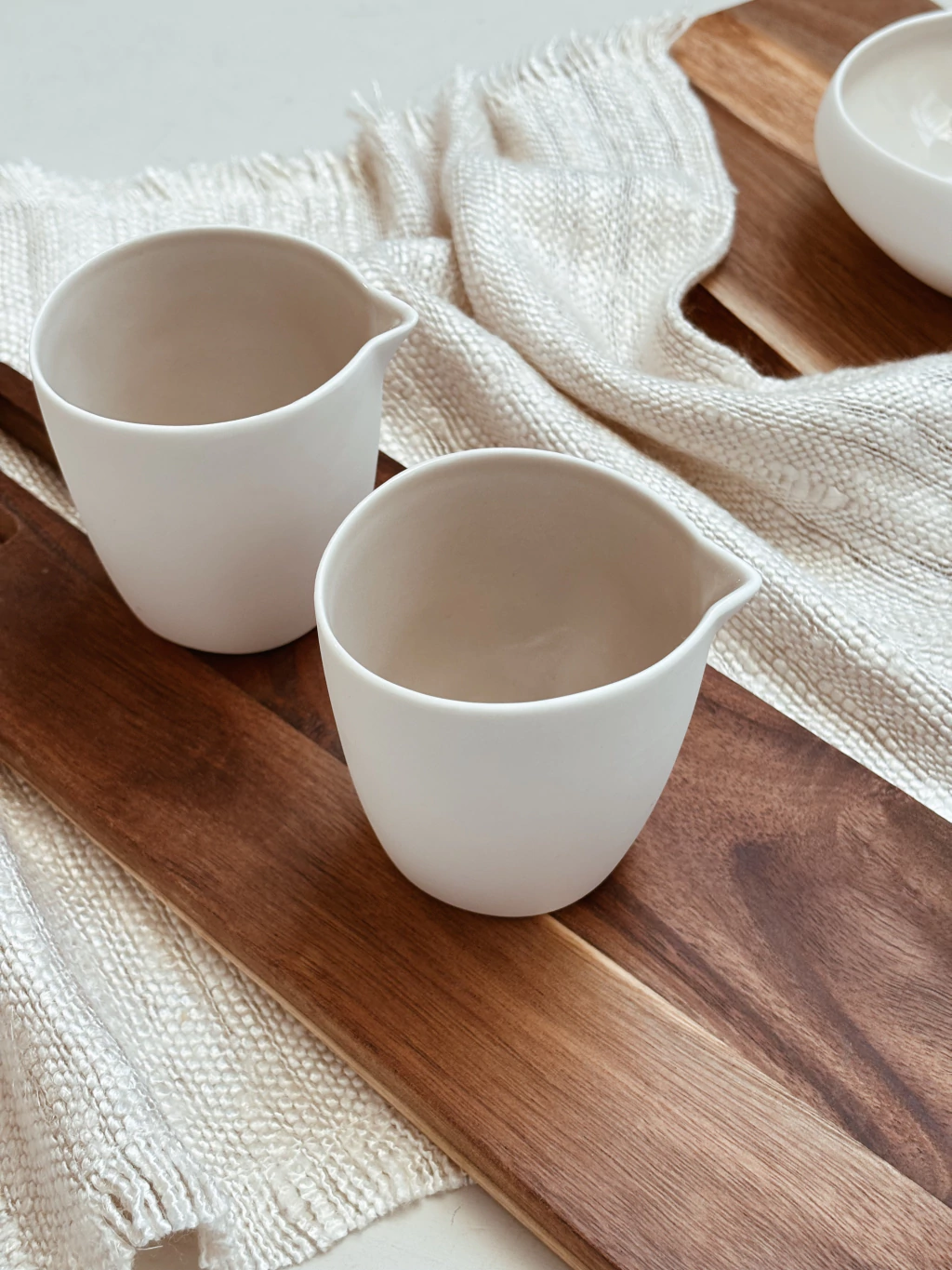 Lechera / jarrita de porcelana esmaltada por dentro en color beige y blanco mate por fuera