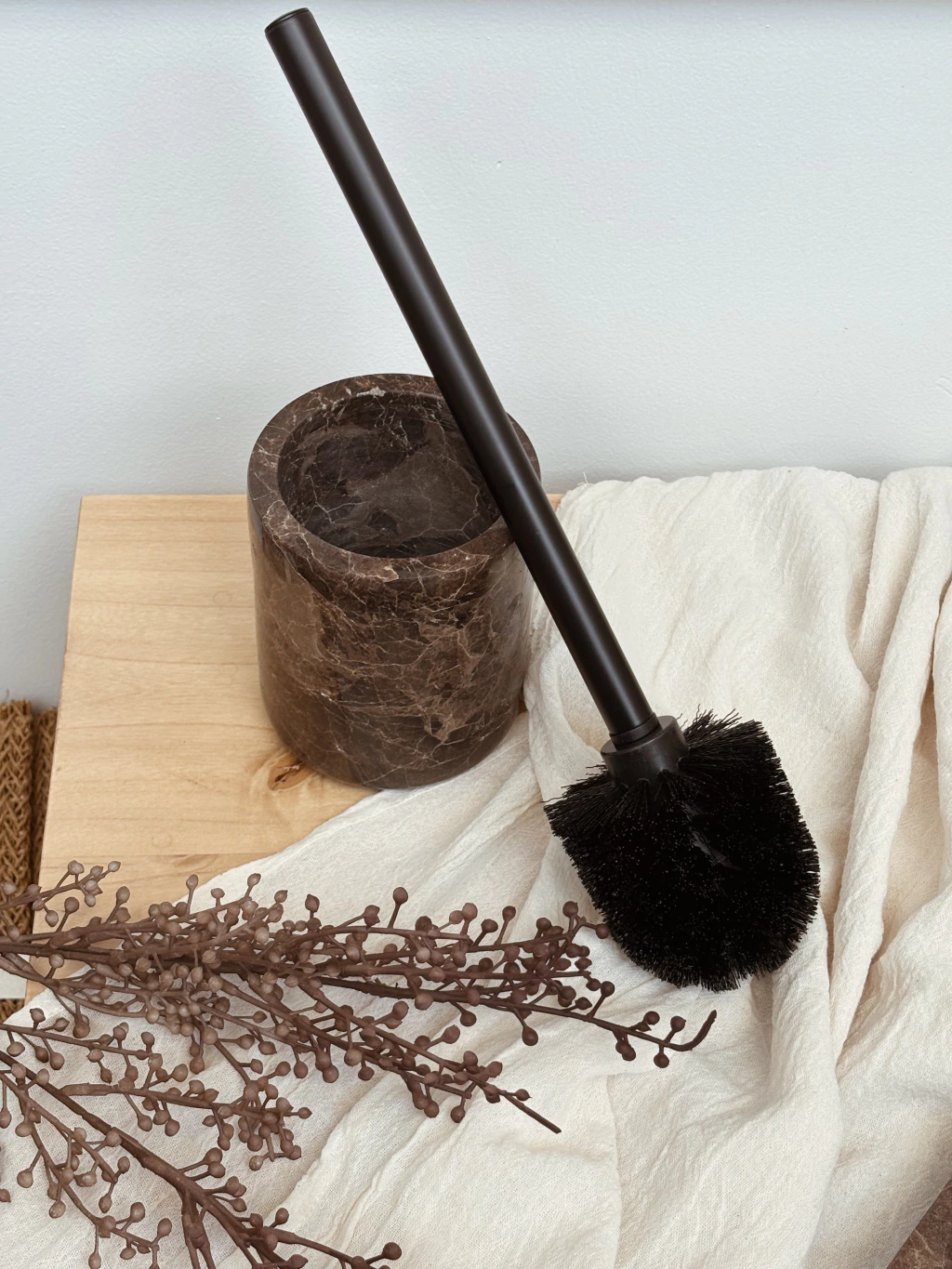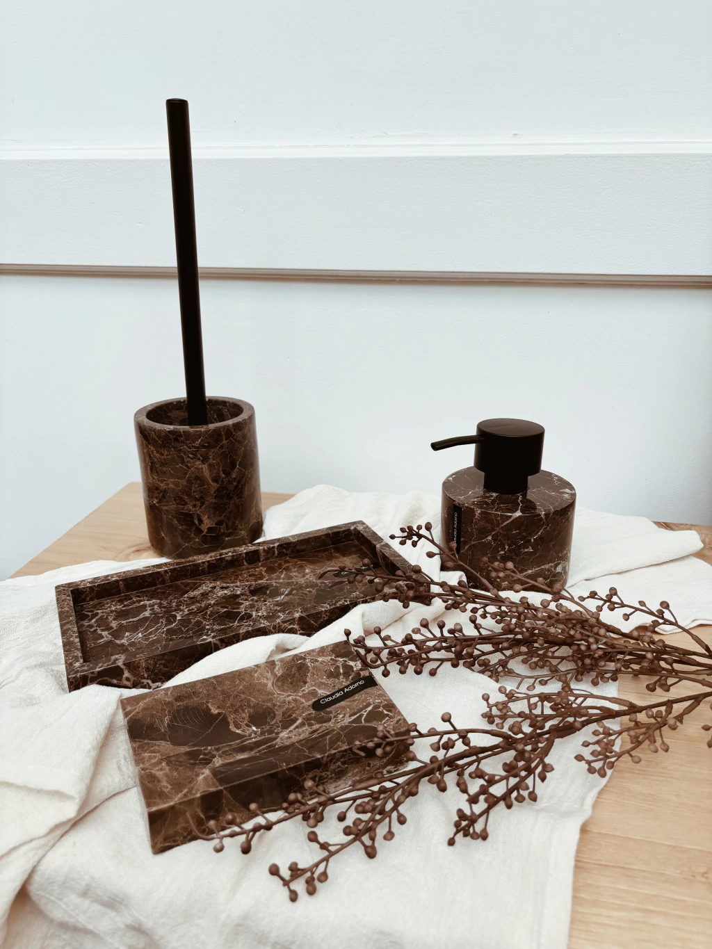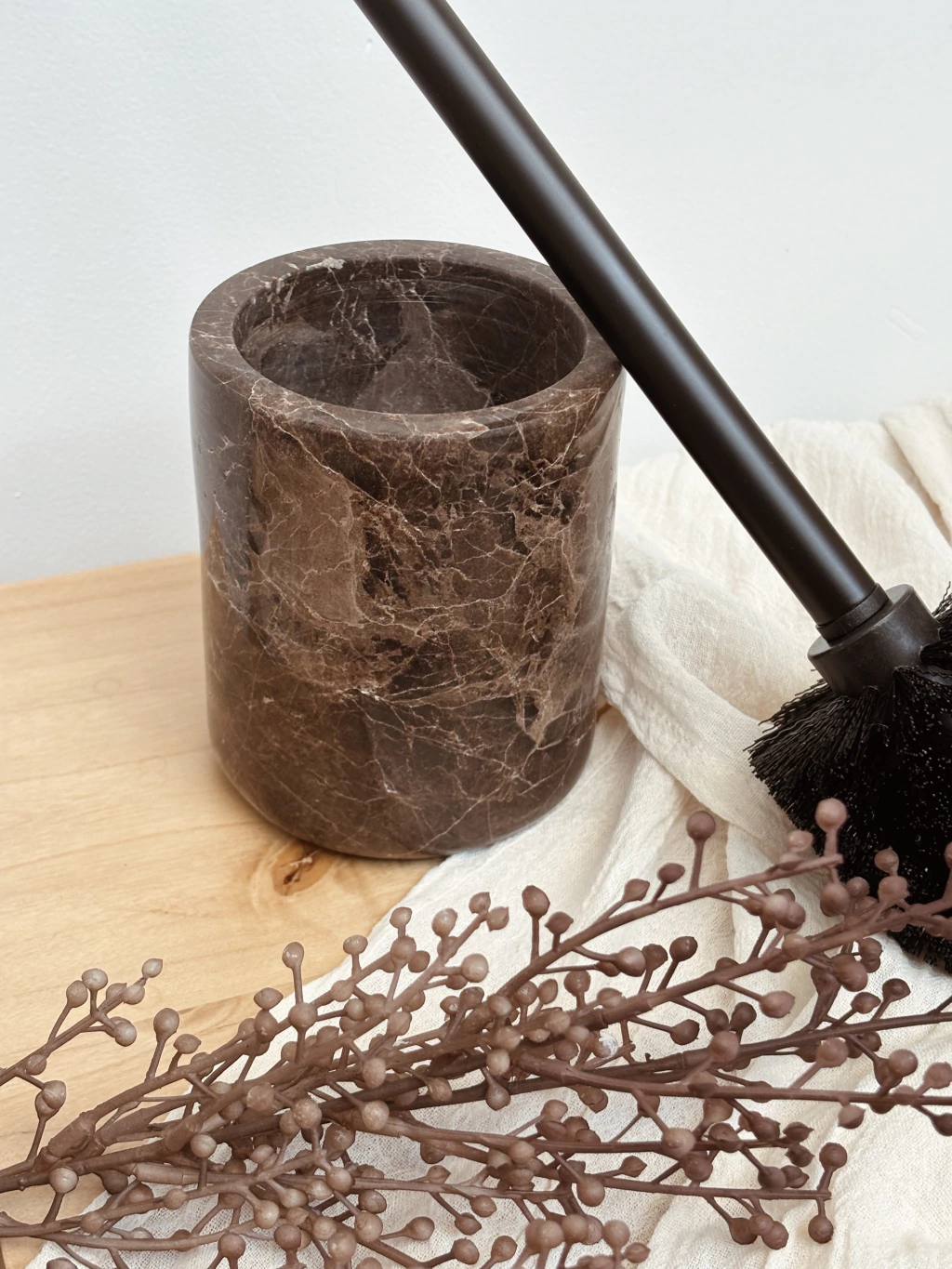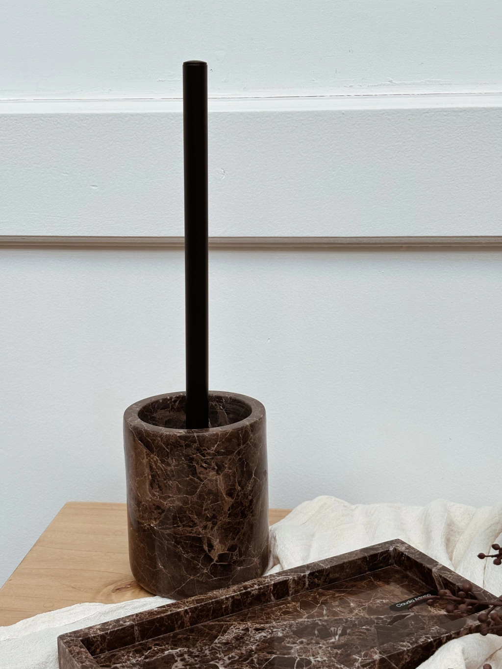 Limpiainodoro 100% marmol color marron con vetas claras con accesorio negro mate