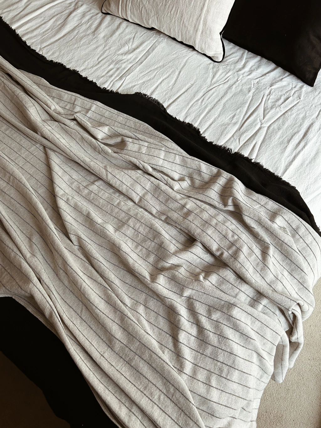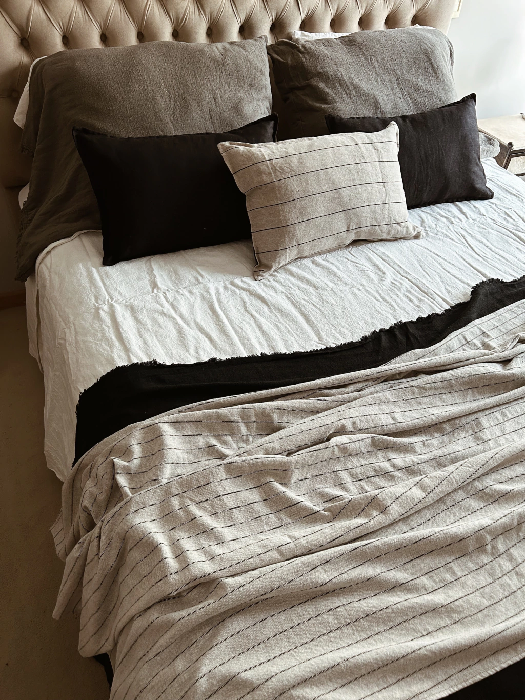 Manta de lino y algodon color habano claro con rayas finas bordadas en negro