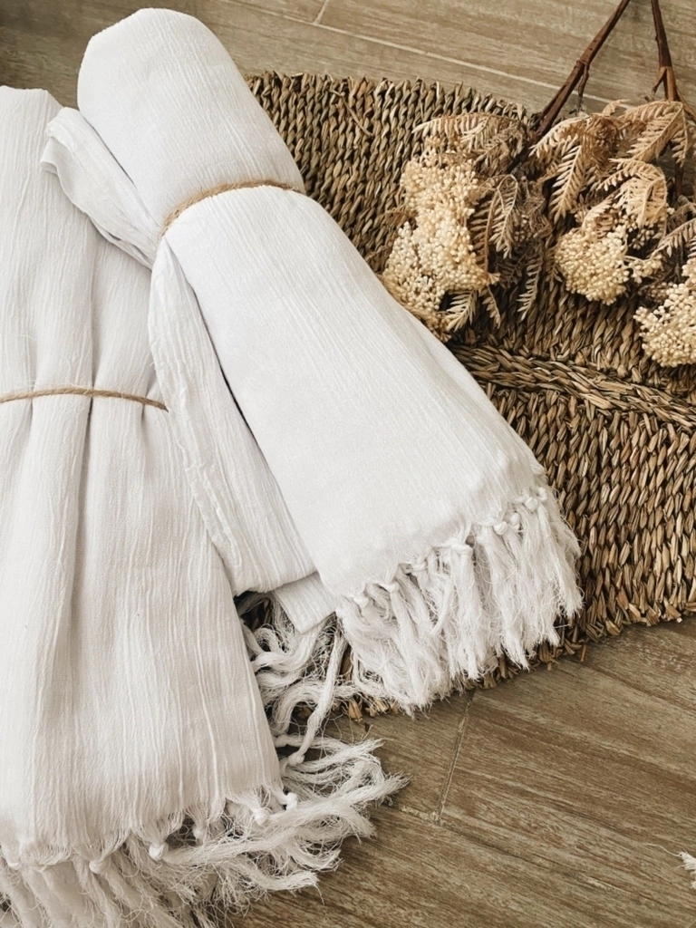 Mantel de gasa de algodón blanco con flecos en los laterales