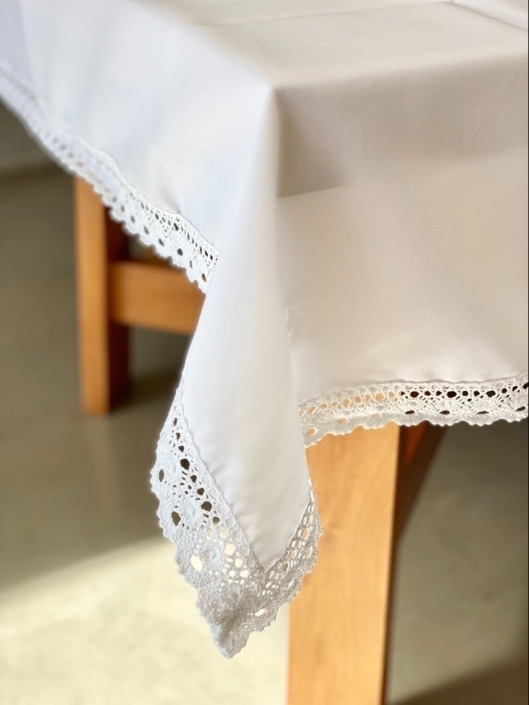 Mantel de tela 100% poliester, con puntilla de algodón en todo el contorno. Es un mantel super práctico: fácil de lavar y planchar.