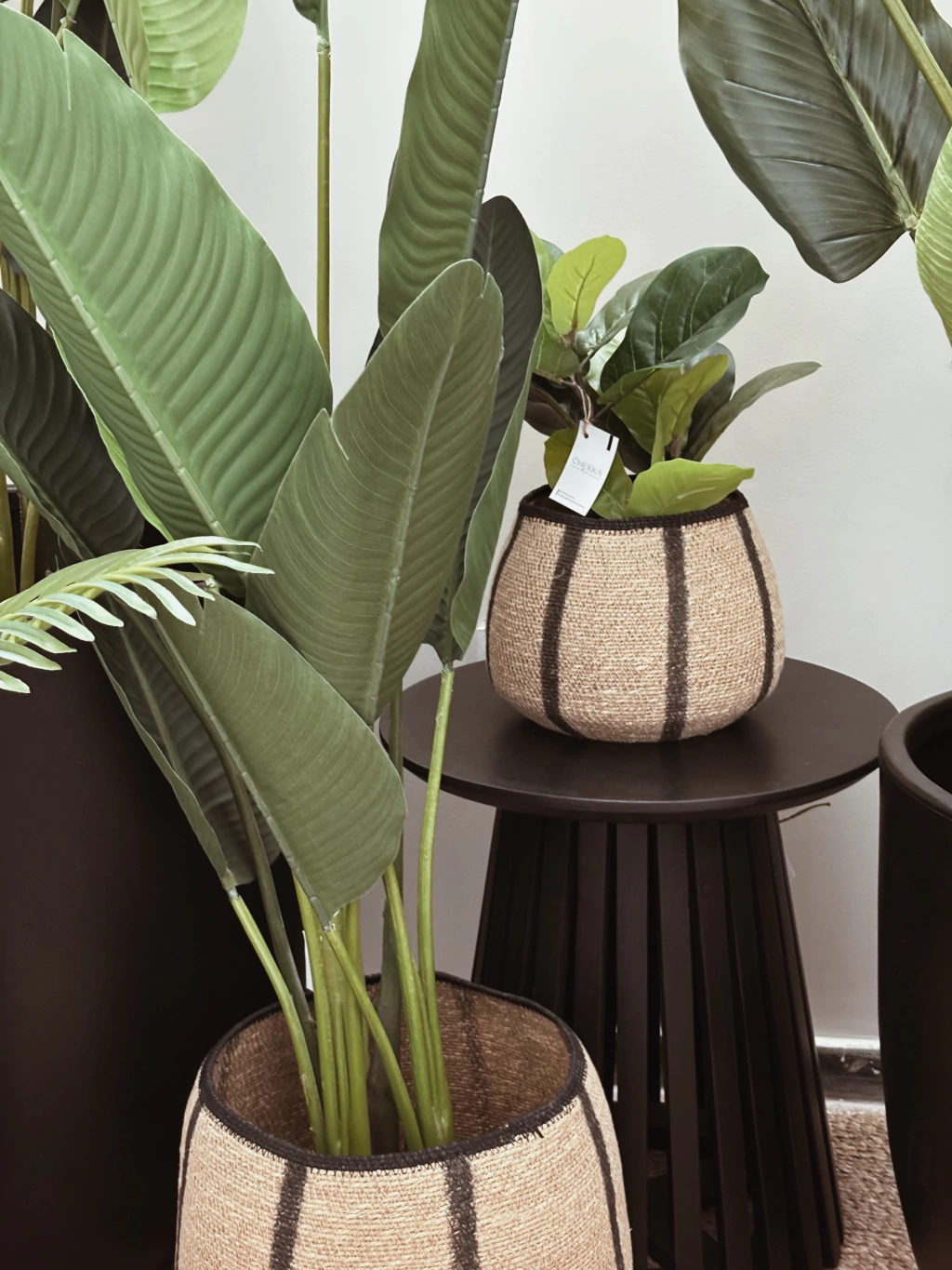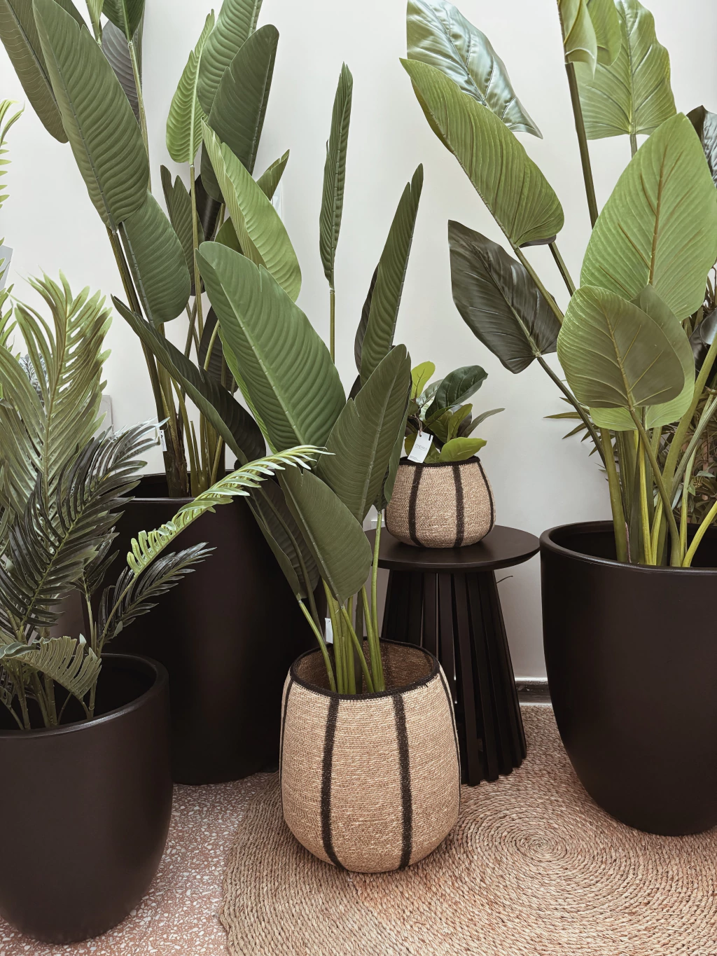 Planta artificial Ravenala con maceta de plastico negra de 18cm de diámetro x 15cm de alto
