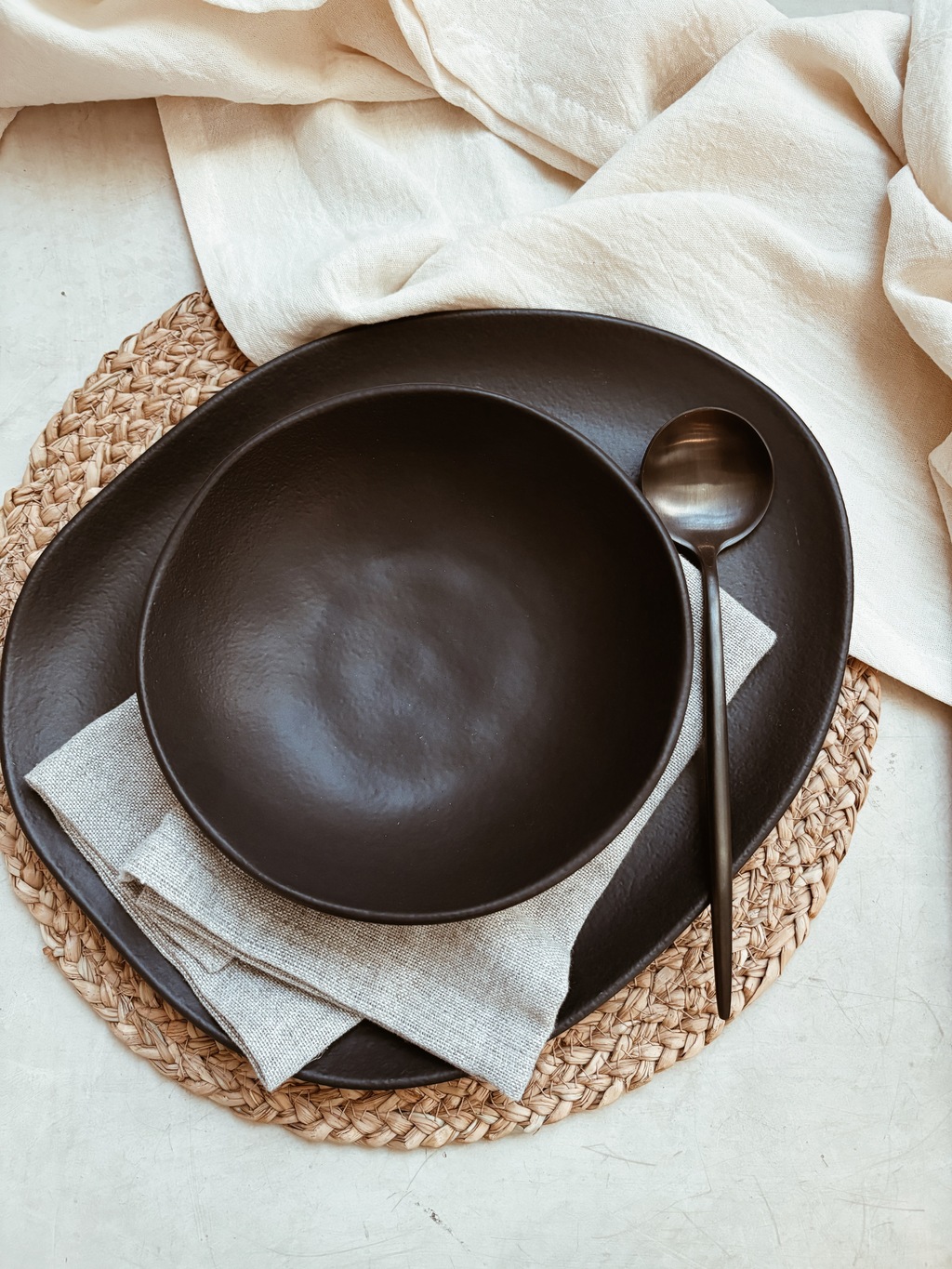 Bowl bajo / plato hondo redondo de cerámica de gres color negro mate con terminación rústica