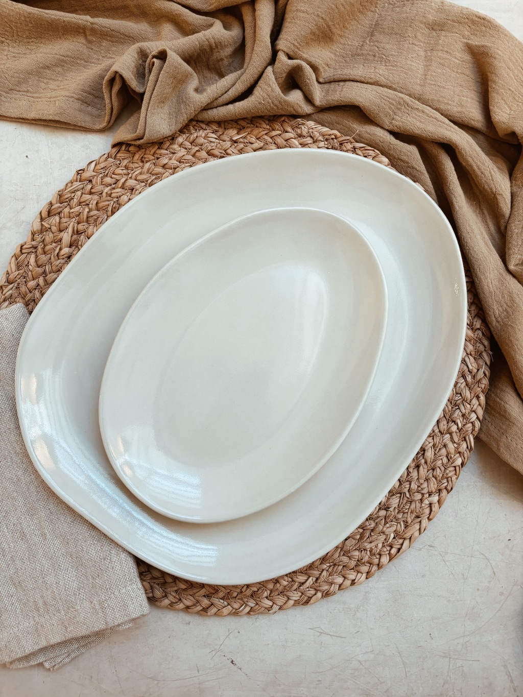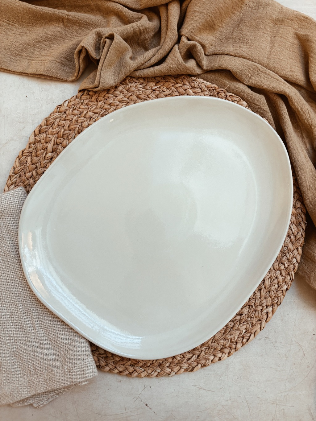 Set de 2 platos playos con forma irregular ovalada de cerámica de gres color crudo, terminación brillosa con acabado rústico