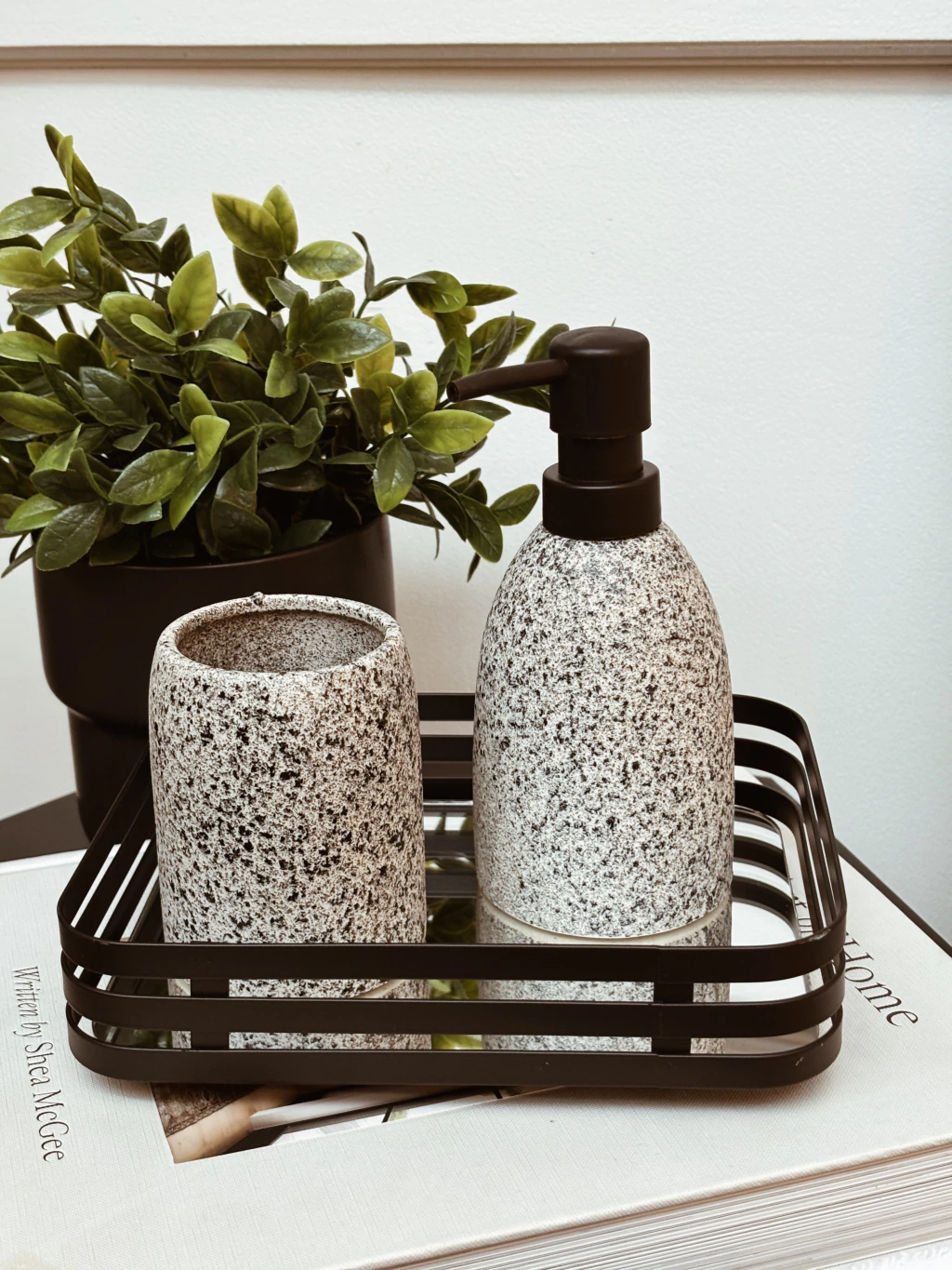Portacepillo de ceramica con salpicado en color gris, visón y negro
