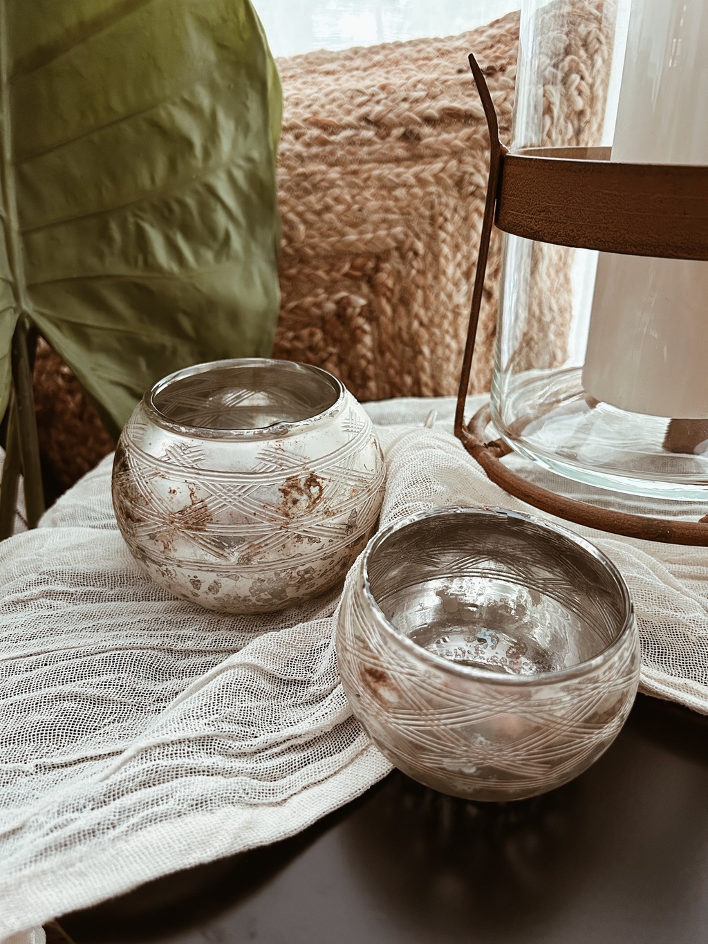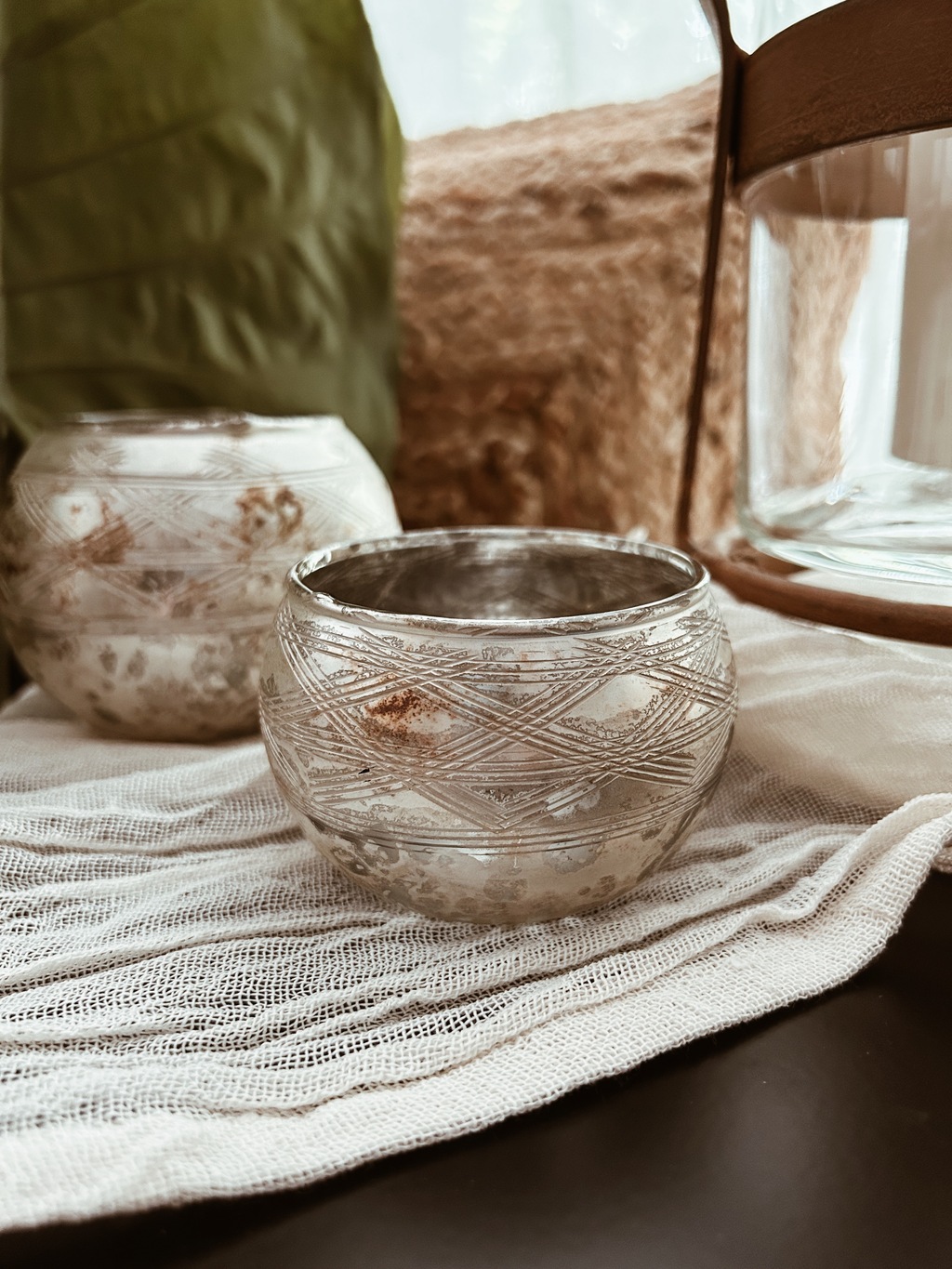 Portavela de vidrio redondo color plateado viejo
