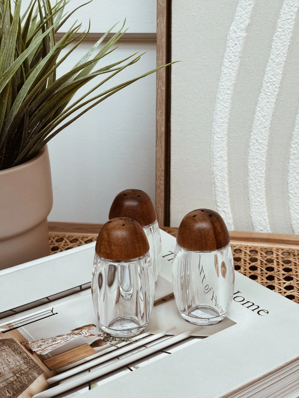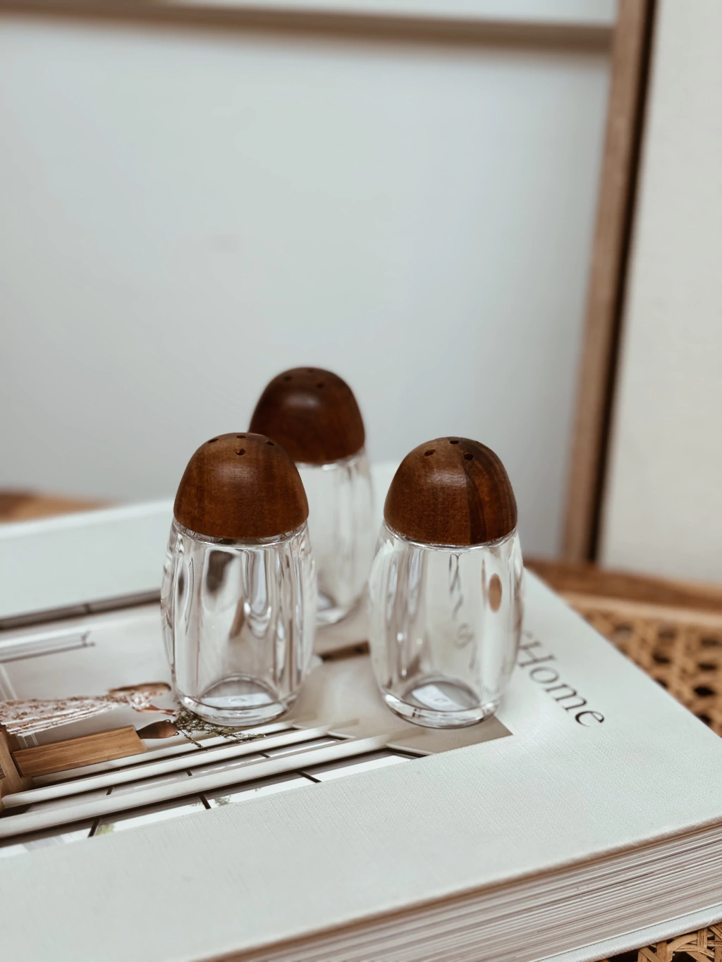 Salero de acrílico transparente con tapa a rosca de madera de acacia