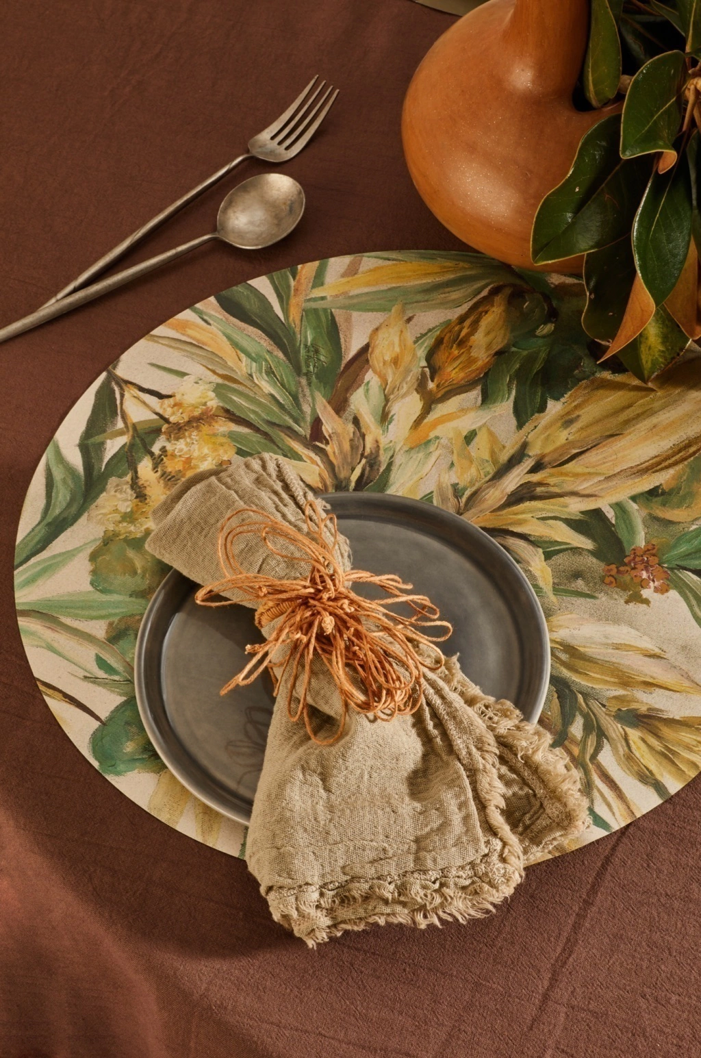 Set de 4 servilleteros hechos a mano, confeccionados con hilo de algodon teñido montados sobre anillo de madera.