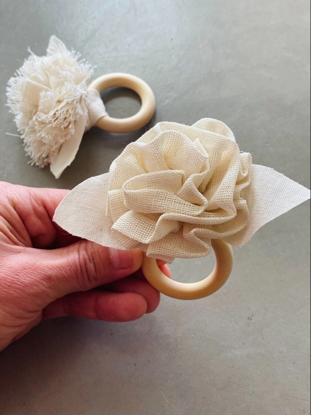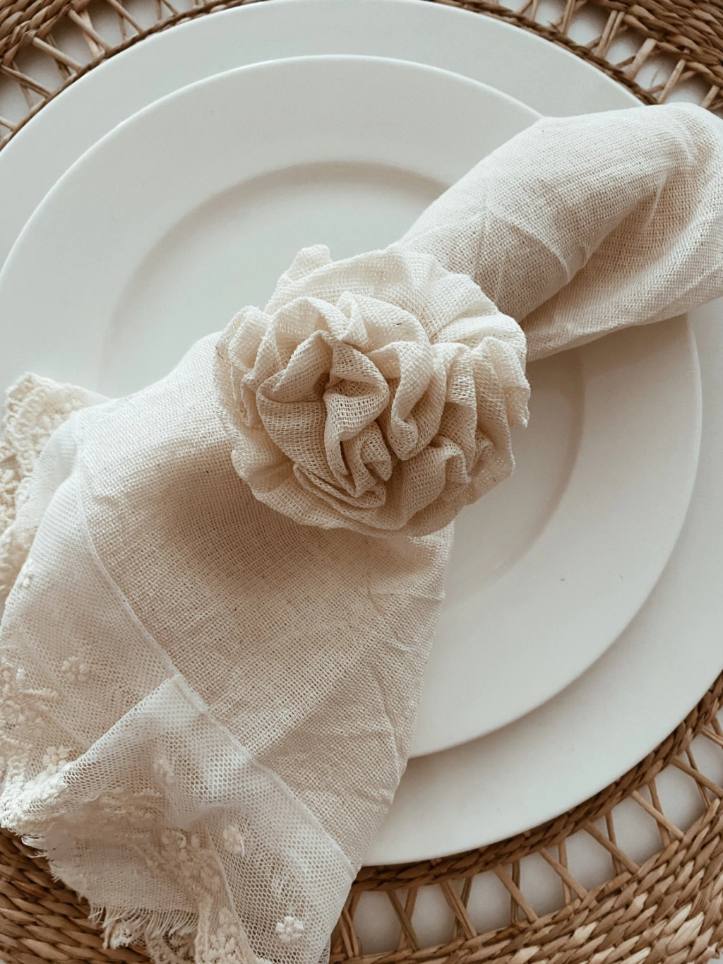 Set de 4 servilleteros confeccionados a mano, con aro de madera y flores en gasa de algodón en color crudo