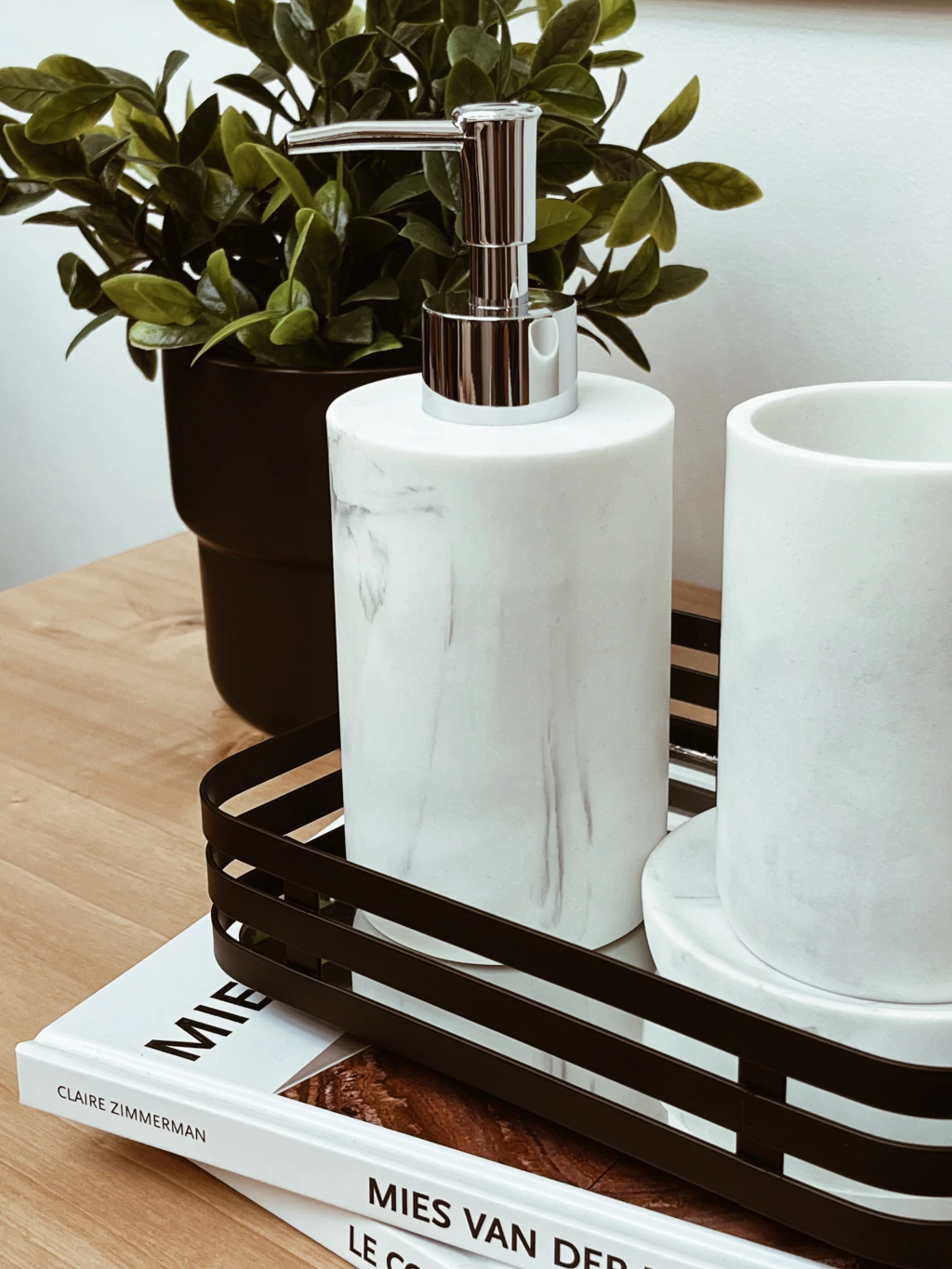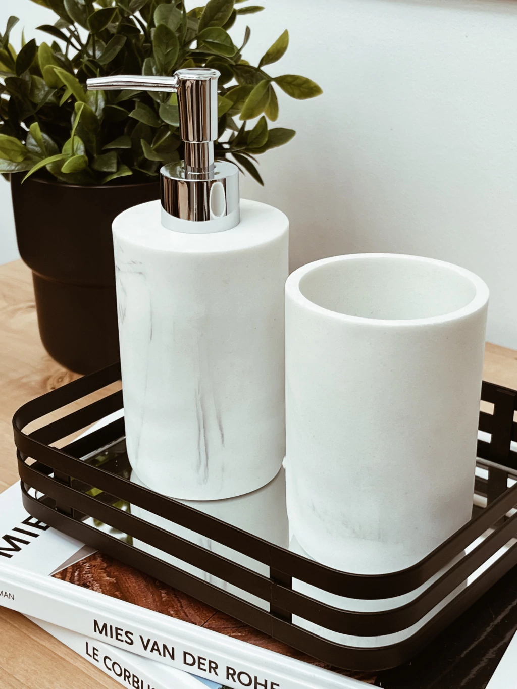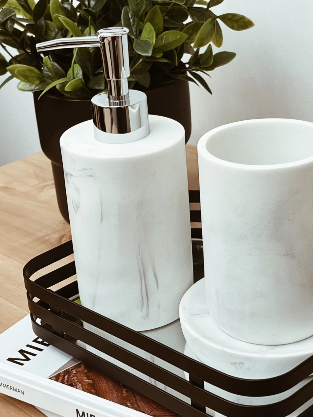 Set de baño de 3 piezas de resina efecto simil marmol. Incluye vaso, jabonera y dispenser