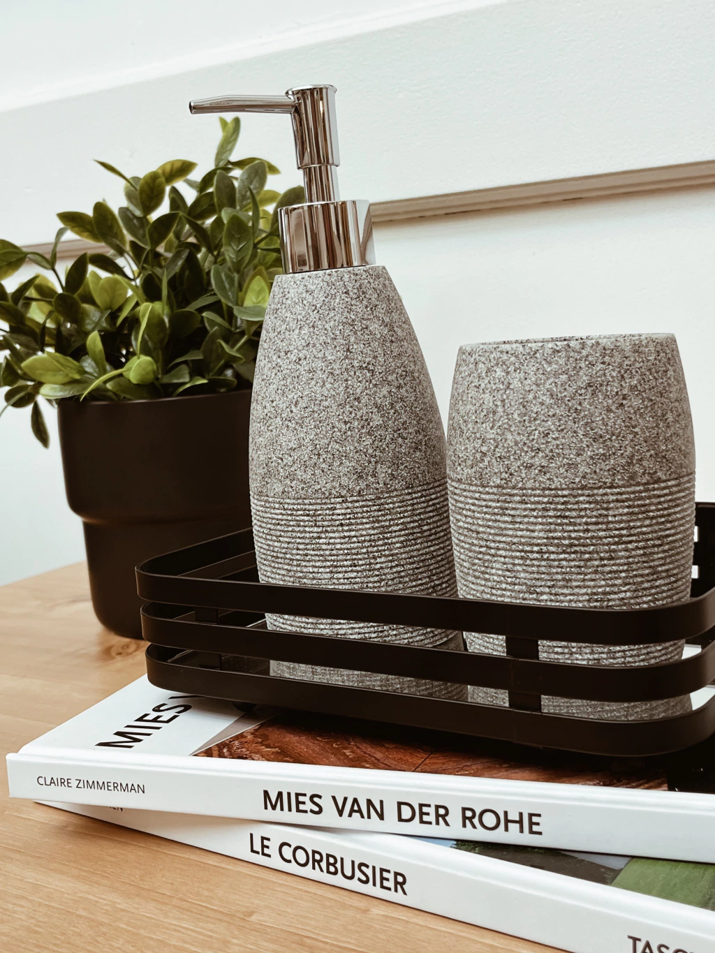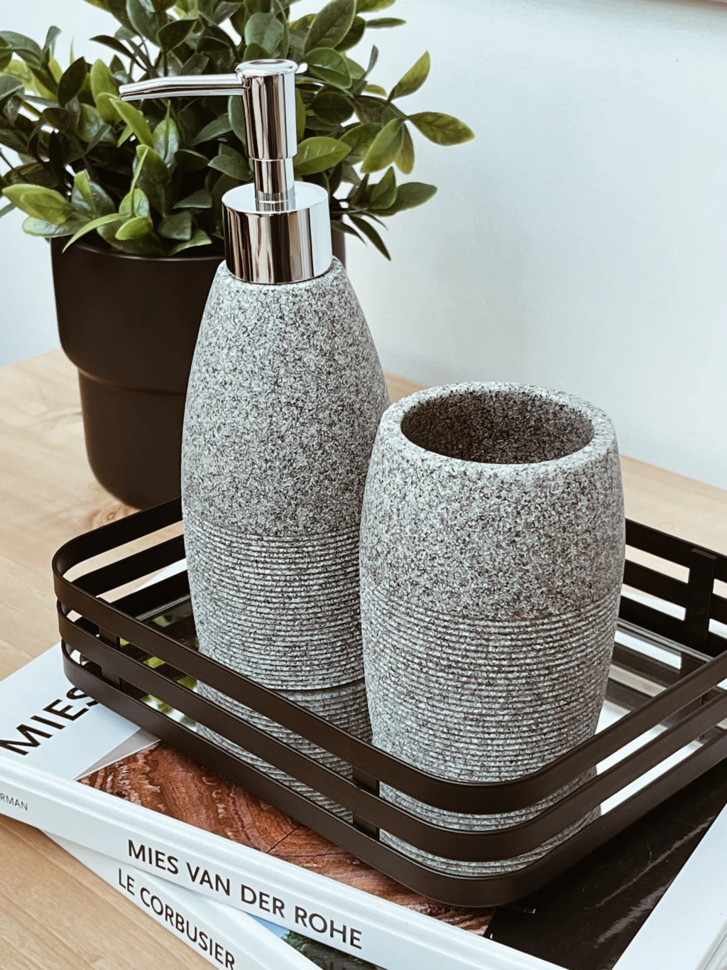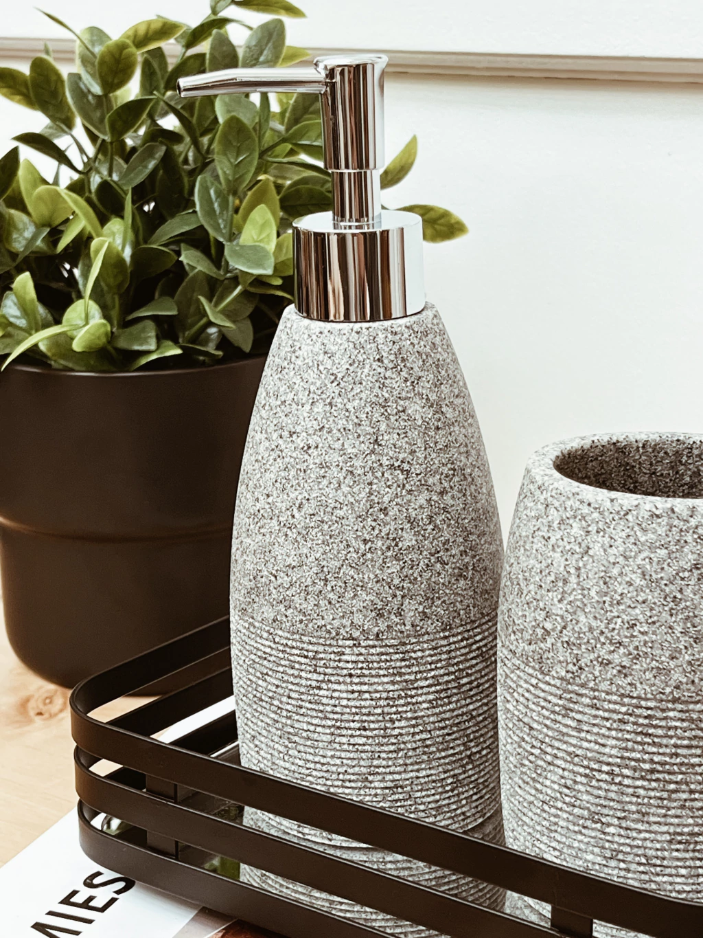 Set de baño de 3 piezas de resina color gris piedra con detalle rayado. Incluye vaso, jabonera y dispenser