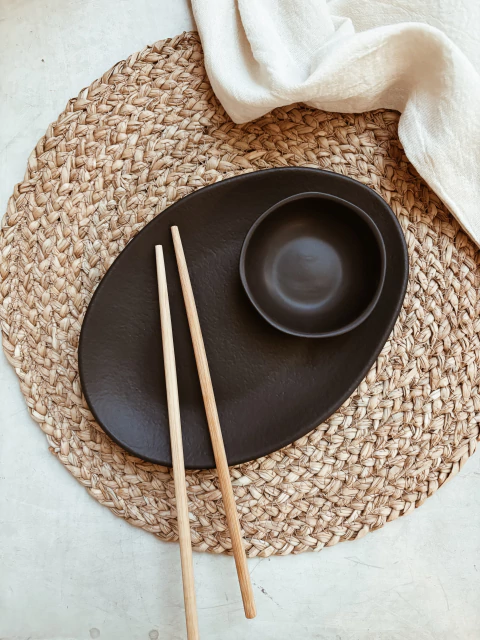 Set de sushi compuesto por 1 bandeja con forma irregular ovalada y 1 cuenco de cerámica de gres color negro mate con terminación rústica