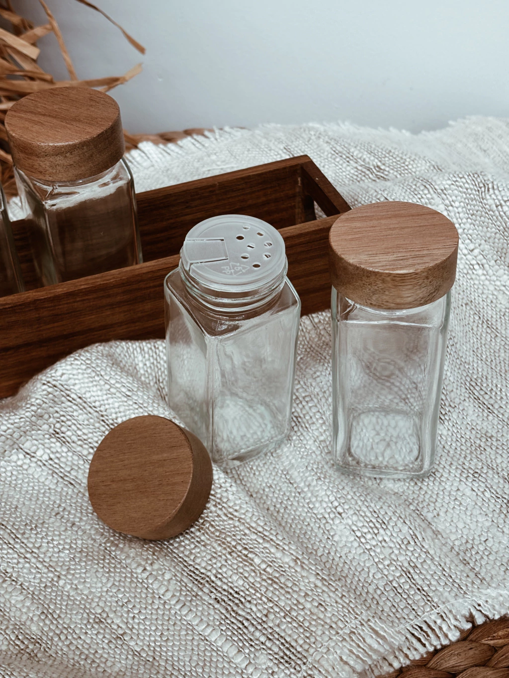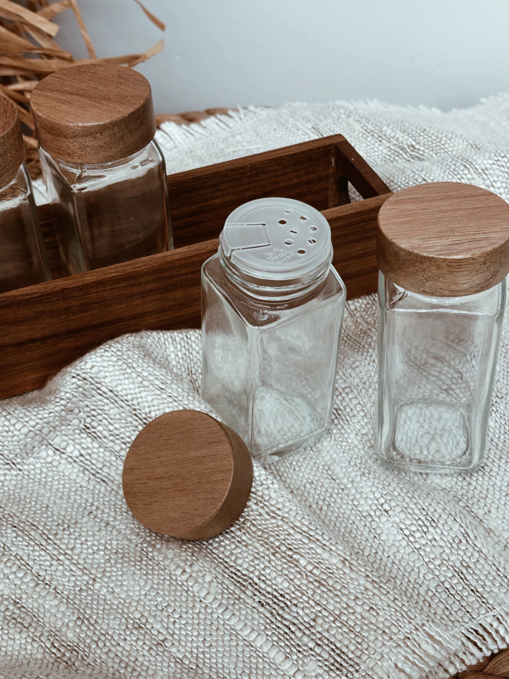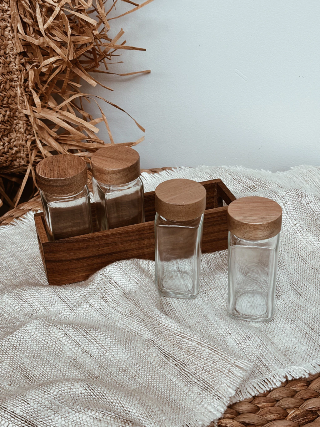 Caja de madera de acacia con 4 especieros de vidrio con tapa de acacia a rosca