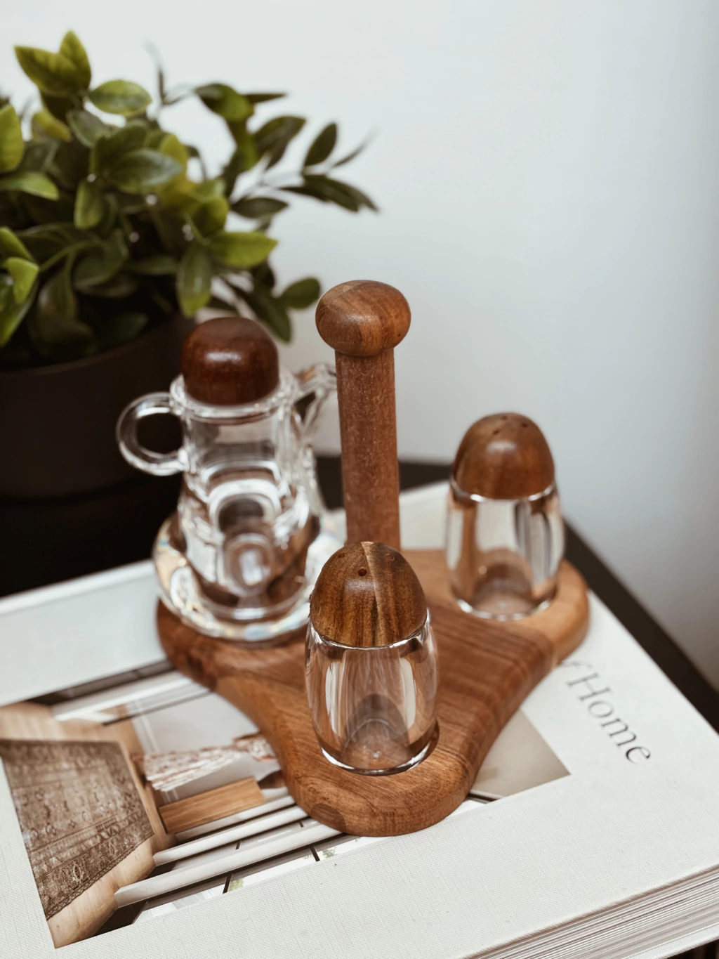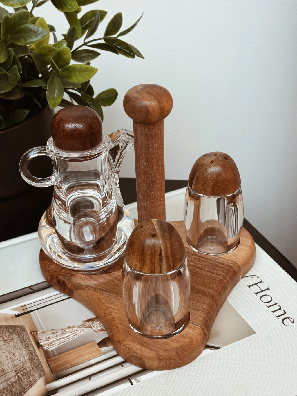 Set de bandeja de madera de acacia irregular con 1 salero, 1 pimentero, y 1 jarrita para aceite