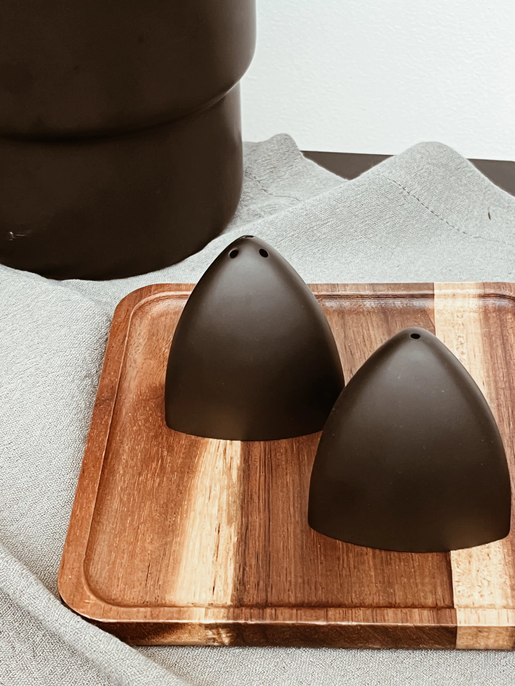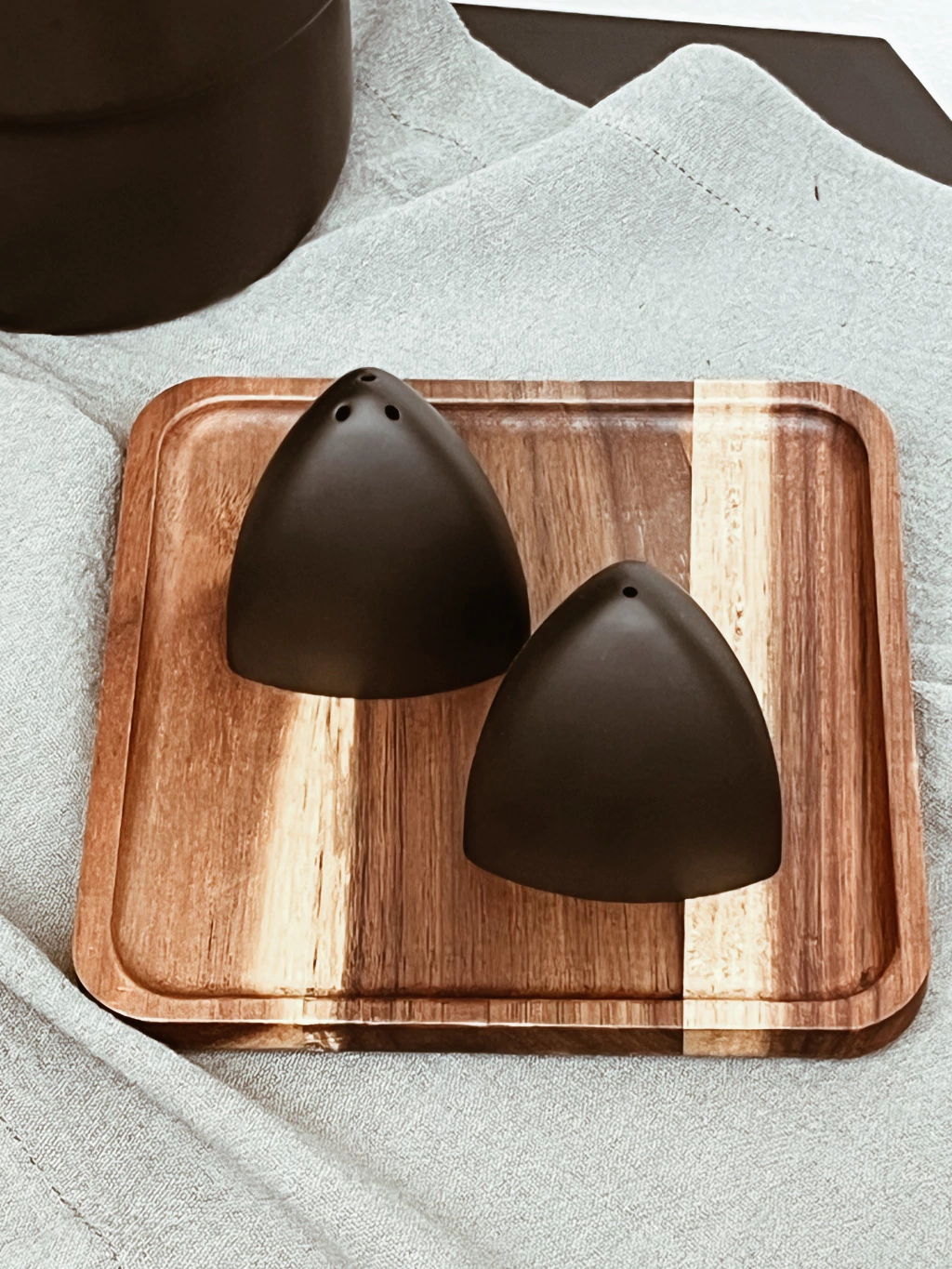 Set de salero y pimentero de acero inoxidable terminación negro mate con tapón de silicona en la parte inferior. Base triangular
