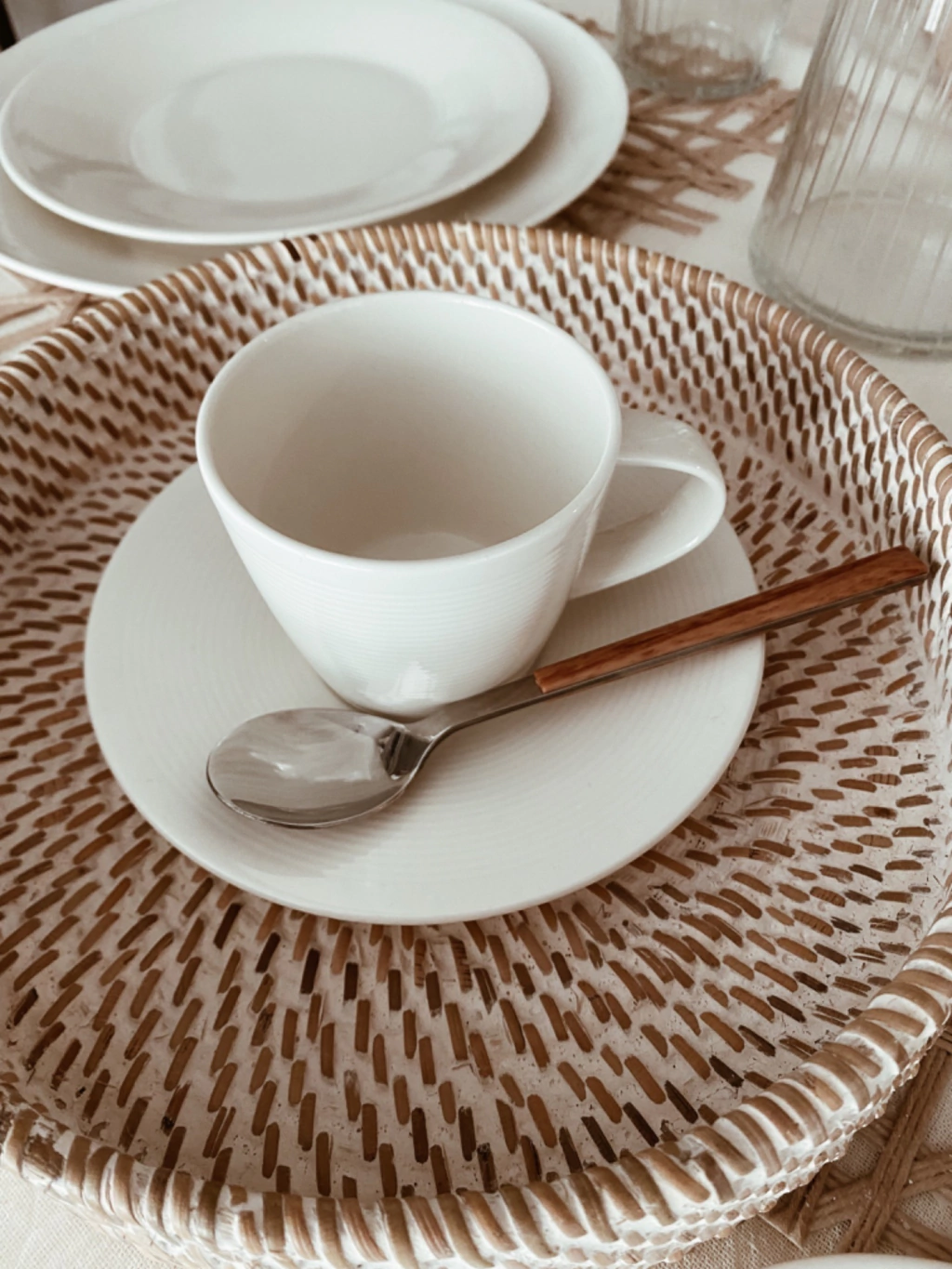 Set de 6 tazas de té y platos de porcelana esmaltada color blanca con rayas