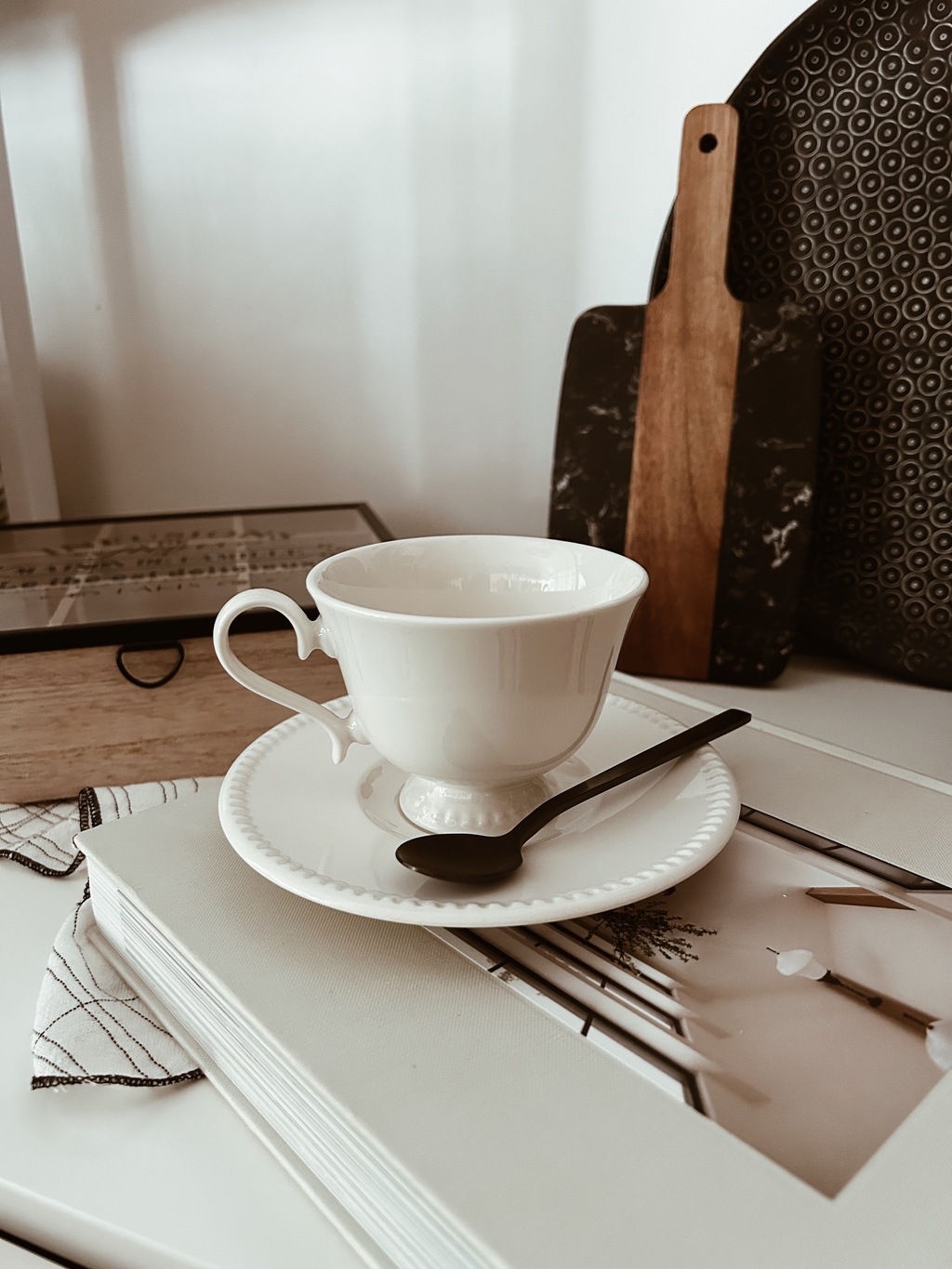 Set de 6 tazas de té y platos de porcelana esmaltada color blanca con puntitos en el borde