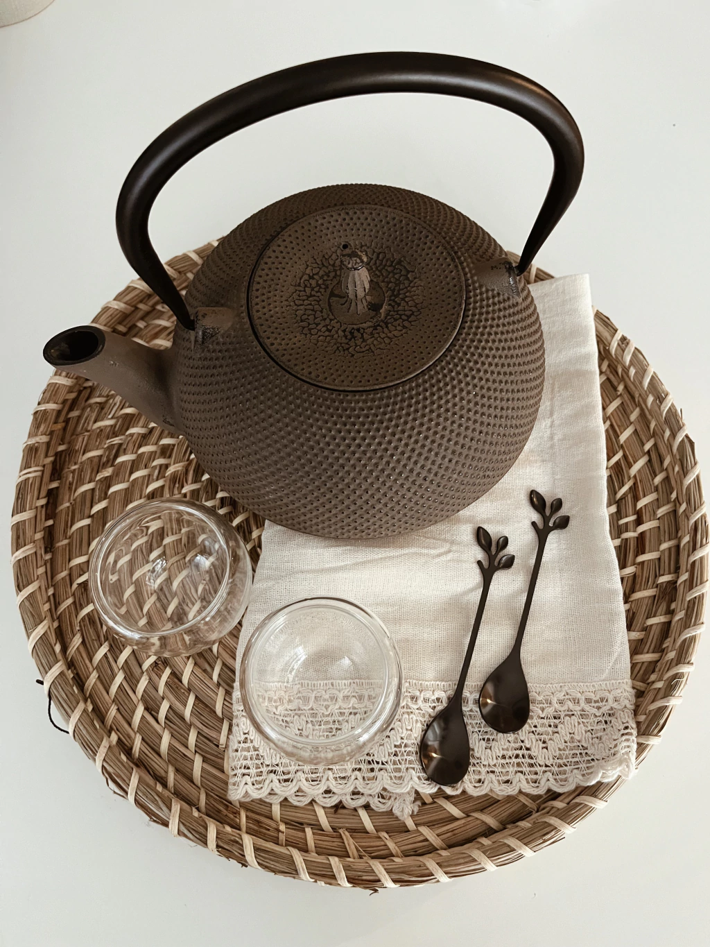 Tetera de hierro con diseño de puntos, color visón con detalles y manija en negro. Su material permite mantener la temperatura del té por más tiempo. Viene con colador de acero