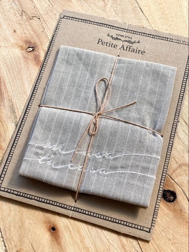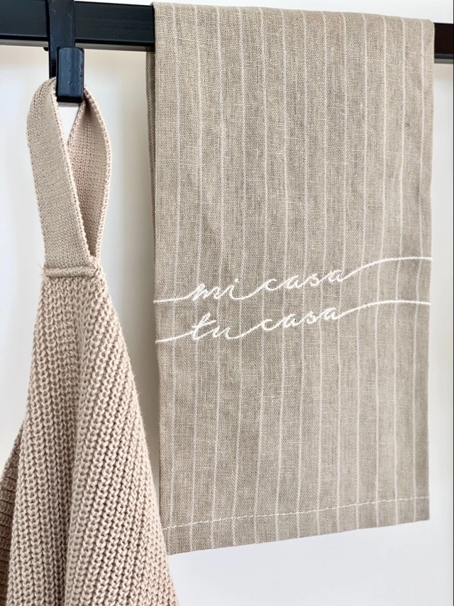 Guest towel de lino color vison con rayas blancas bordado de frase en color blanco