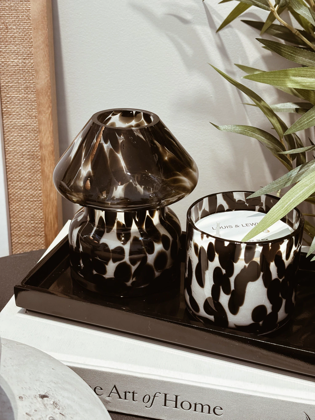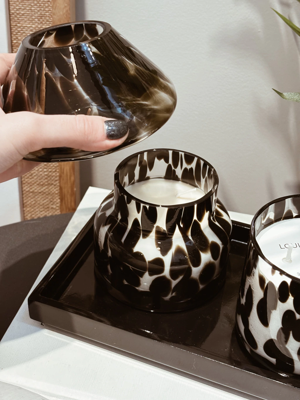 Vela en dos piezas de cera de soja 100% natural. Envase de vidrio transparente con salpicado en negro