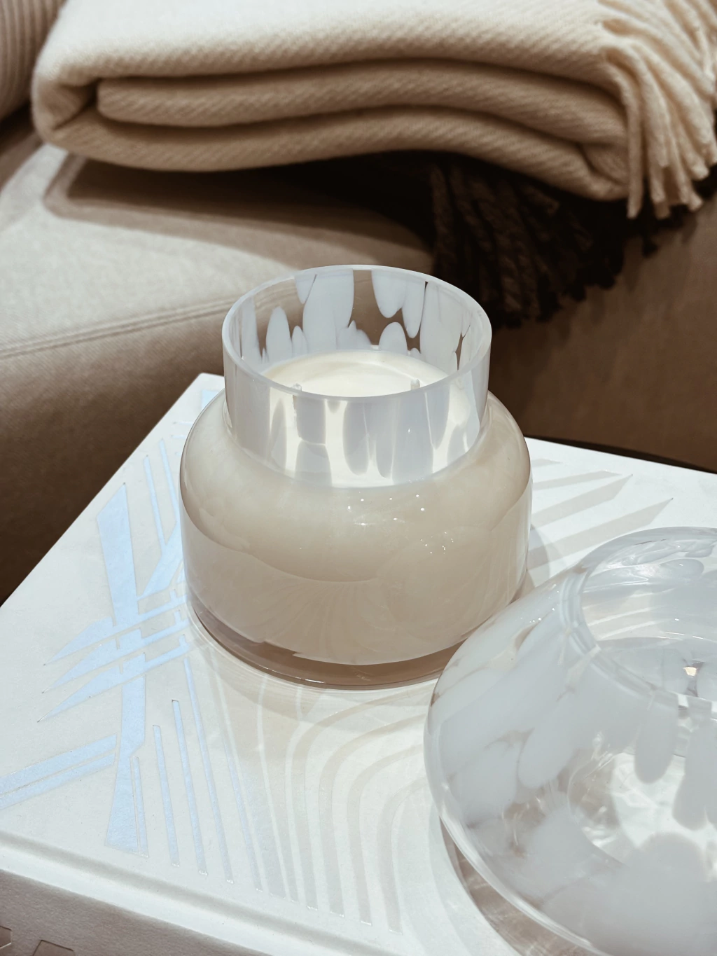 Vela en dos piezas de cera de soja 100% natural. Envase de vidrio transparente con salpicado en blanco